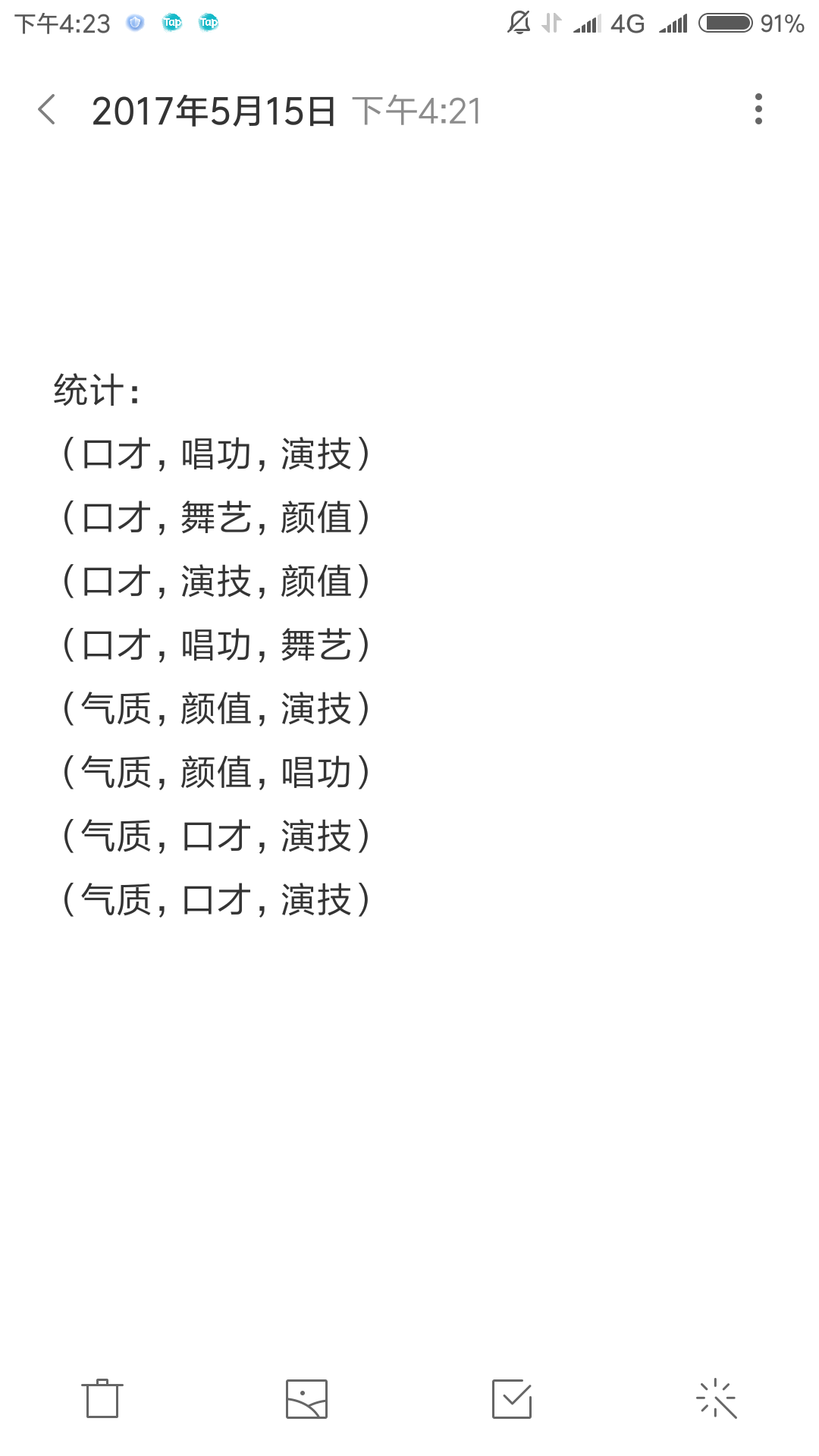 上图是我这两天统计的商演需求属性,可以看到同一个名字的商演(比如地方电台访谈)需求的属性可能不一样,而不同名字的商演可能需要相同的属性,也就是说需求属性随机,但总共也就需要这几种(是的,并不是所有可能都会出现,有些组合是没有的,这也就使得我们可以培养三属性艺人来接商演)。于是我总结出了下图,就是商演所需要的属性。