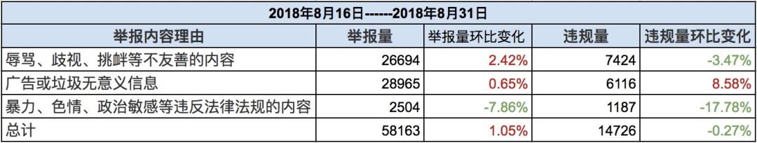 八月后两周的总举报量为58163条,相比上期举报总量环比增长1.05%,实际处理量为14726条,环比减少0.27%,举报成功率为25.3%。八月下半月举报统计总体与上期相比并无明显增减,保持稳定。