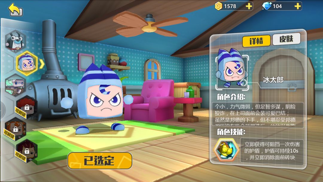技能:是立即获得可阻挡一次伤害的护盾,护盾可持续10s,并立即消除面前砖块,在危机的时刻插墙打洞防御躲避攻击!
