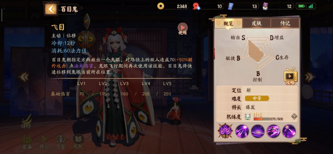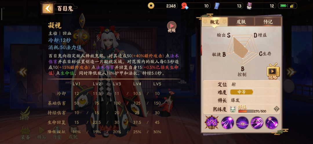 首先是该式神的核心技能——鬼眸,通过三次对任何单位普攻或者使用技能对敌方造成伤害来获取被动层次,当被动层次达到五层会变身机关枪,在4.5秒内大幅度提高DPS。当你准备变身机关枪时,就可以和对面射手莽一波,换血绝对不亏。