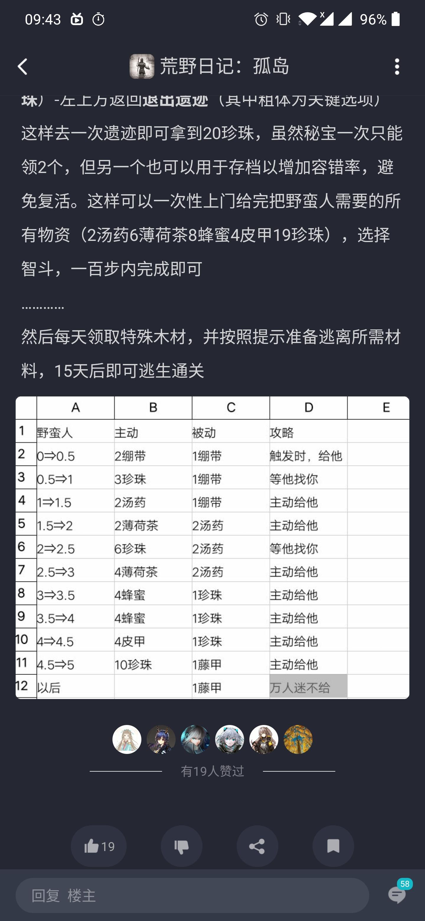 都知道造船逃离,要与野蛮人拉满亲密度,要拉满亲密度,其他的都好弄,最难的就是要给19颗珍珠。在打完湖泊时只给12颗,再要拿到珍珠的话,就要打戈壁了,打戈壁又得去刷其他的图。这样子萌新又得过冬浪费十几天(萌新各个属性都差,打图慢,得跑图)。所以按照上面的攻略,极限35d左右,只打到远山就行了,20d触发野蛮人,15d运送木材。优秀。然而我现在挑二18d打完远山,20d触发野蛮人给绷带,而后一直在家等等到29天野蛮人还是没有来😭,又得速刷戈壁了。请问是脸黑还是上面的攻略版本低?求大佬们给点建议或者给个稳点的速推教程。