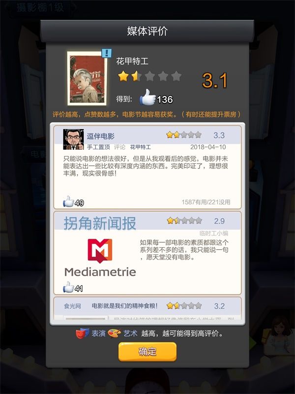 以上介绍了一些个人比较关注的玩点,游戏玩法虽然简单,但内容是非常丰富的,公司经营和升级、星探系统、明星养成、剧本统筹和电影拍摄、影片评分上映、艺人通告路演、电影节评选、票房排名争夺等等,简直就是把现实娱乐圈搬到手机上来了。