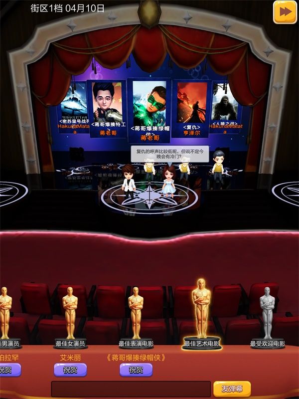 拍摄一部好电影,不仅可以得到观众的认可,还可以进入票房排行榜,和其他玩家争夺票房冠军,并且参与业界奖项评选。当然想拿到超级大奖可不容易,我拍了好几十部电影,也有三四部票房冲到了服务器前列的,就得了一次奥斯卡奖,得奖的那一刻真是爽到了,成就感爆棚。