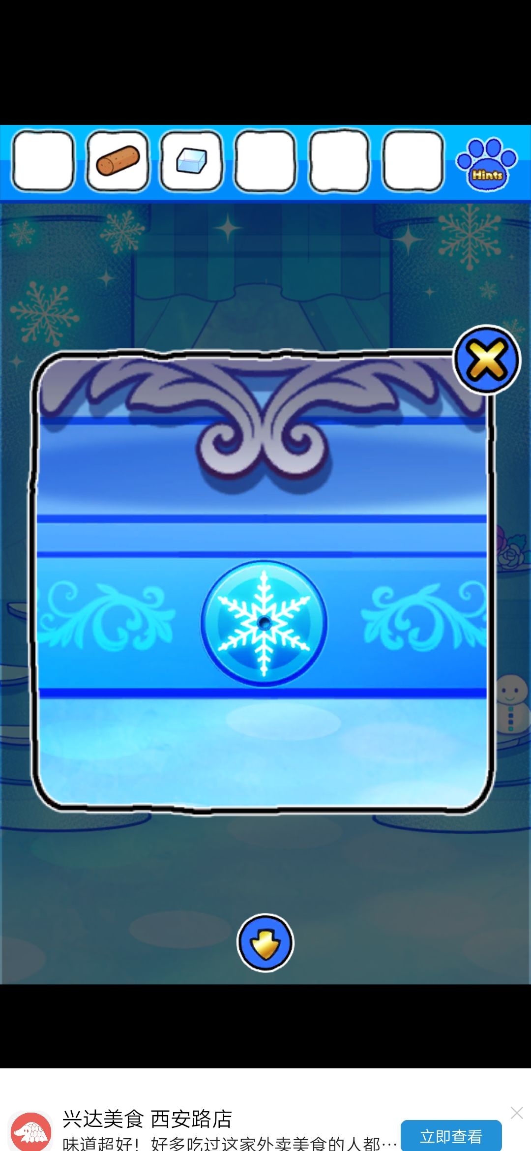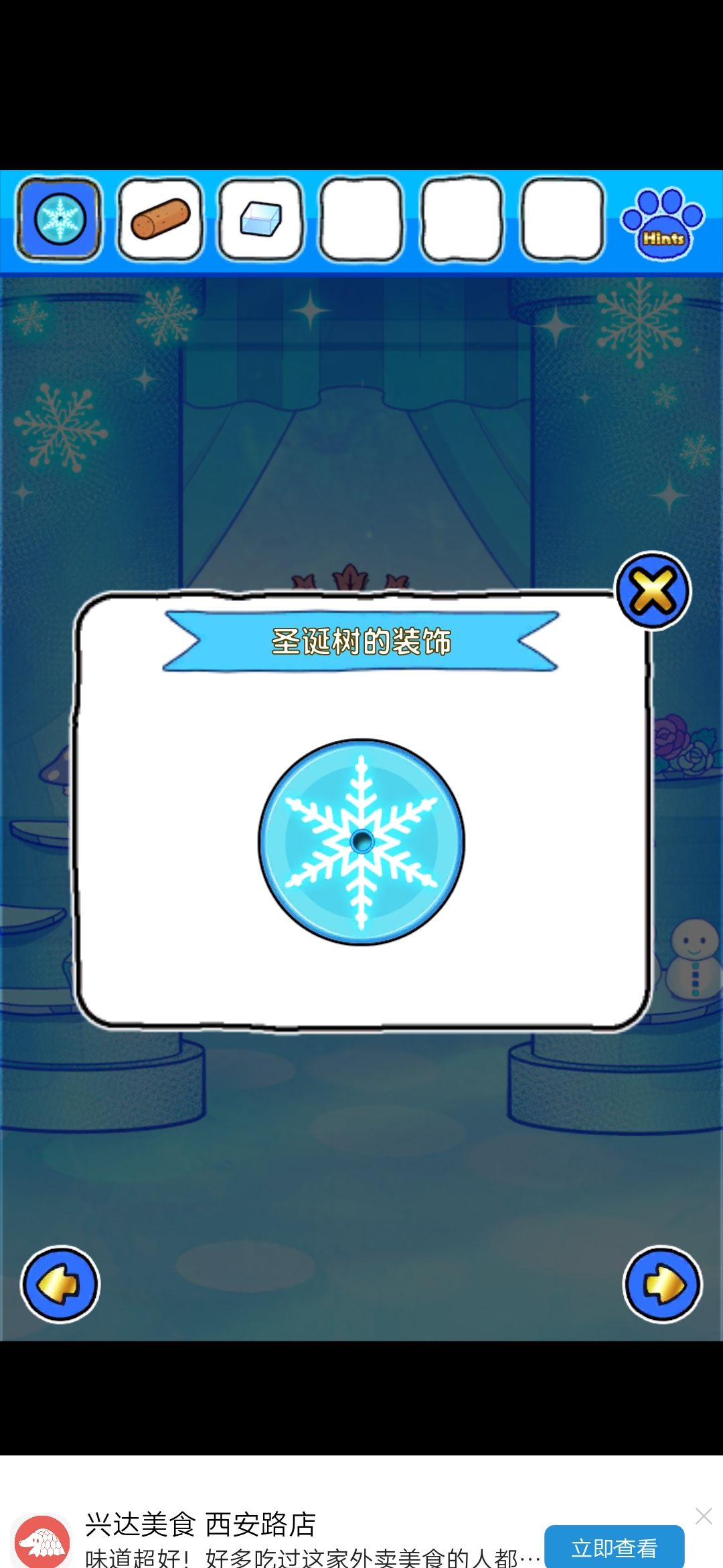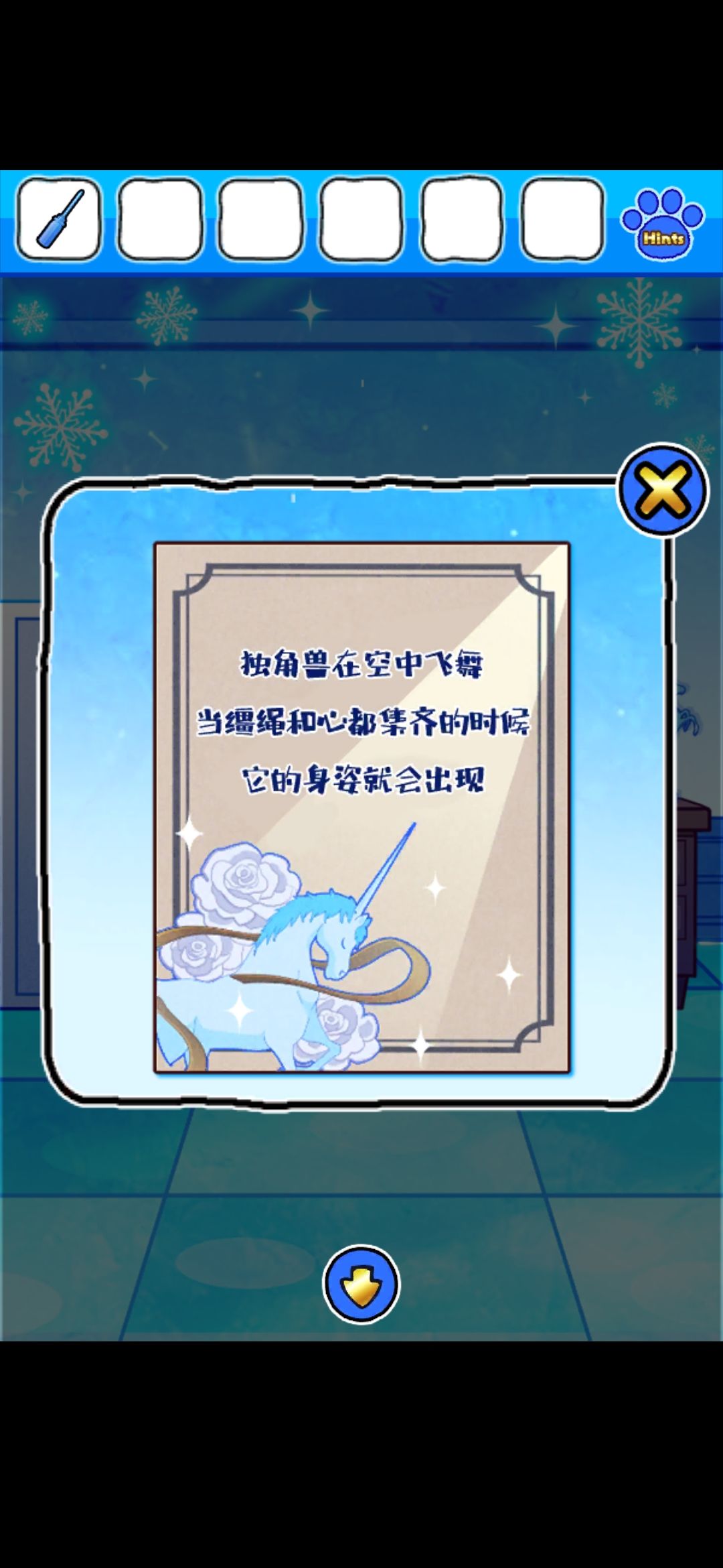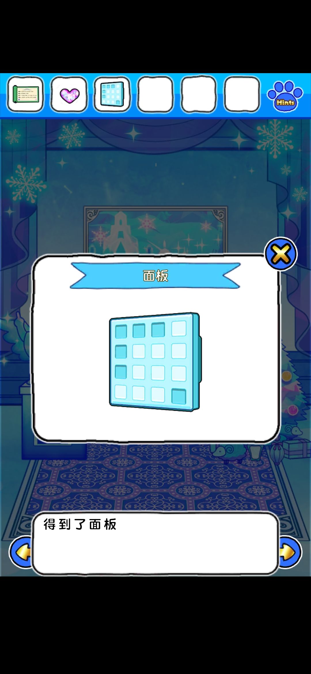 首先,点门旁边的雪花中心的红色按钮,出现凹槽,在镜子界面的雪人可以收集到金色框和塞子,独角兽挂画界面的树上收集到圆形装饰