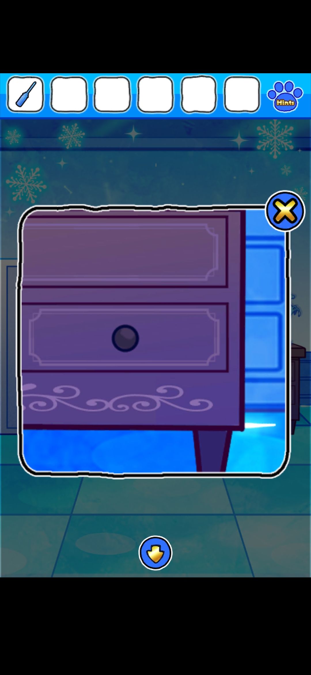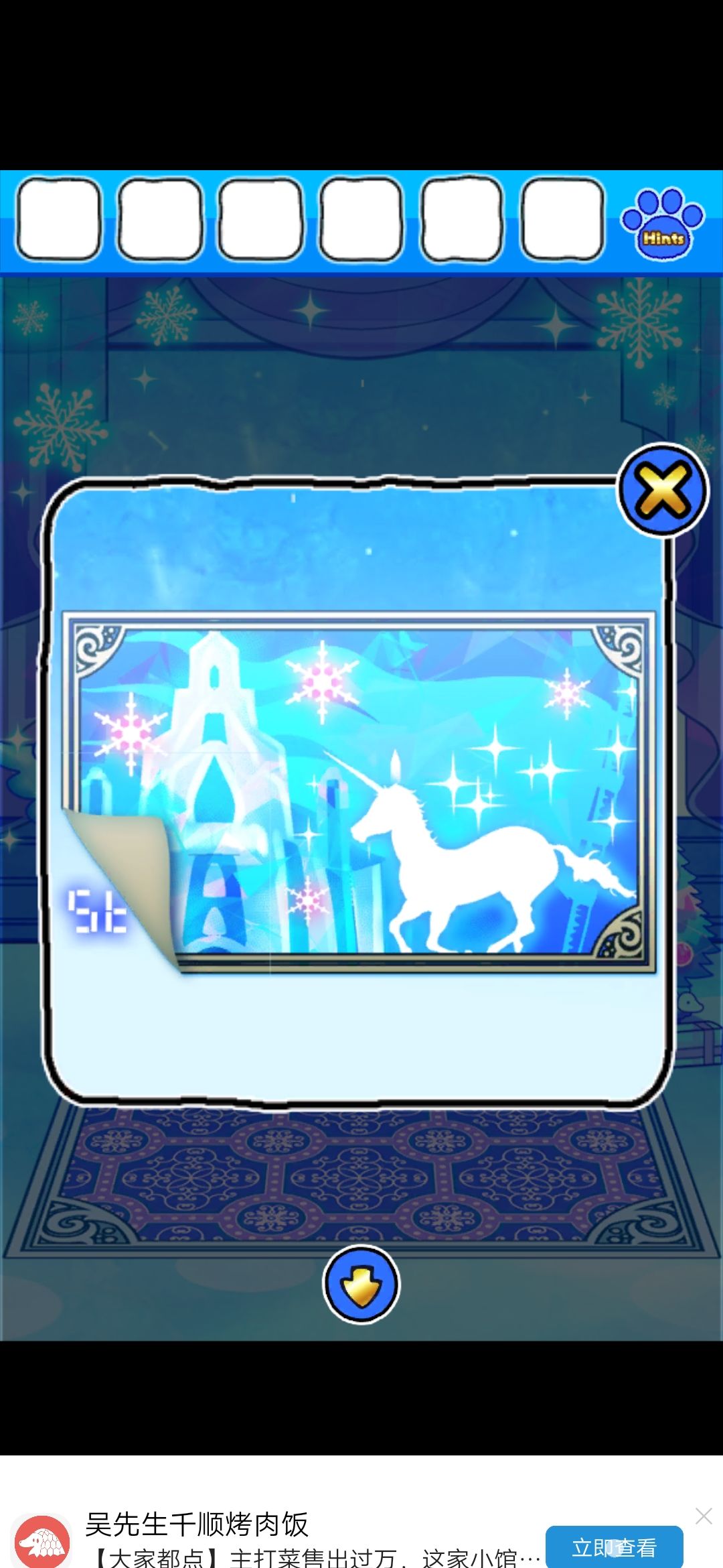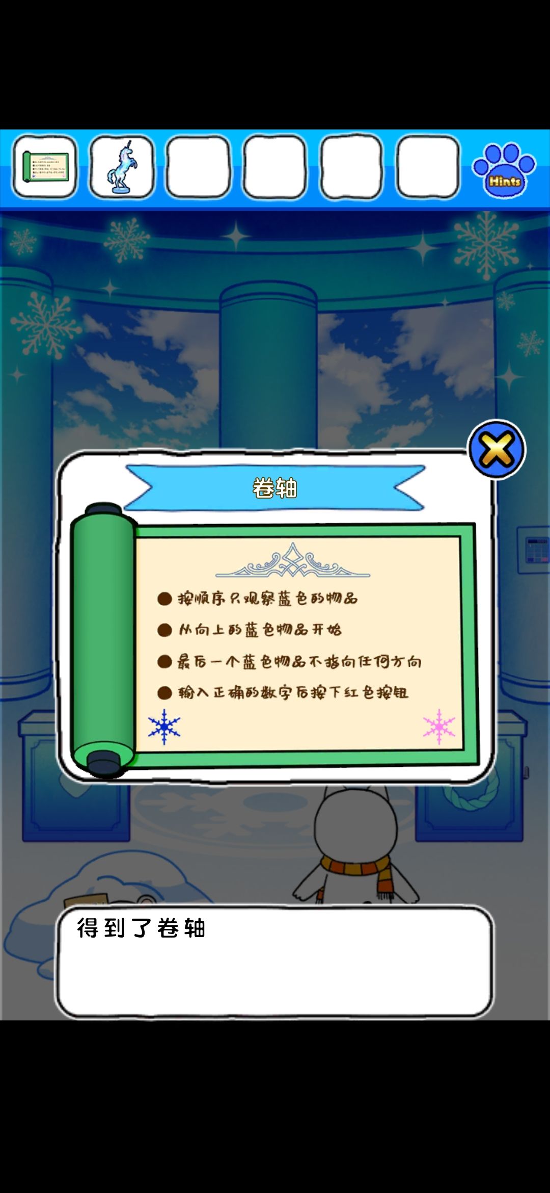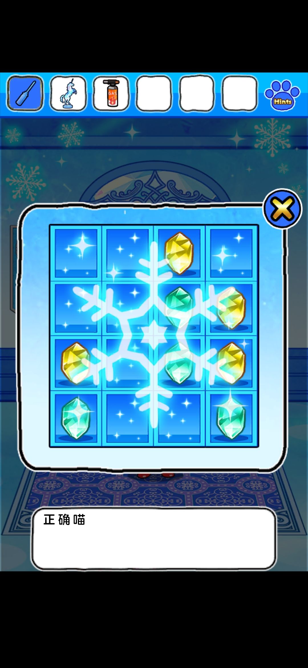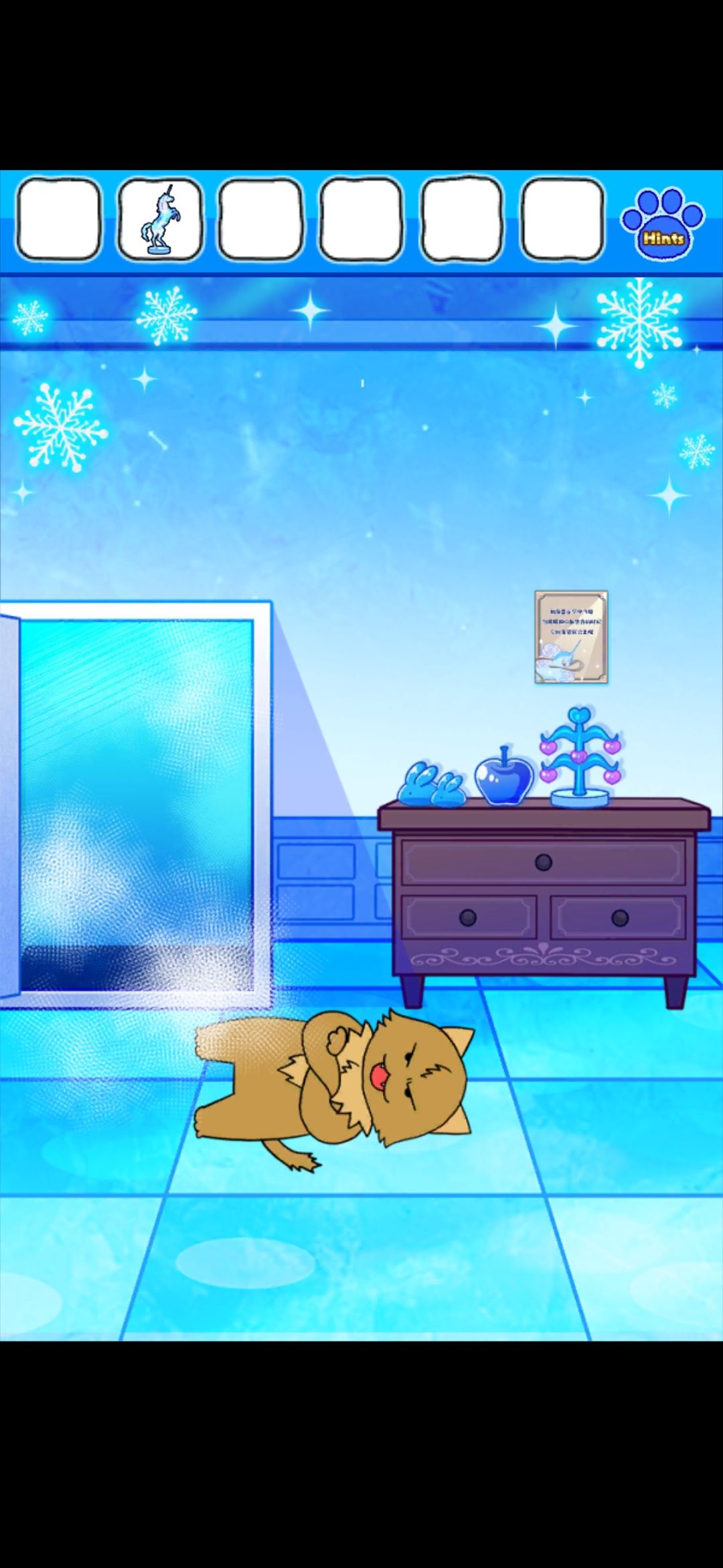 首先,点门旁边的雪花中心的红色按钮,出现凹槽,在镜子界面的雪人可以收集到金色框和塞子,独角兽挂画界面的树上收集到圆形装饰