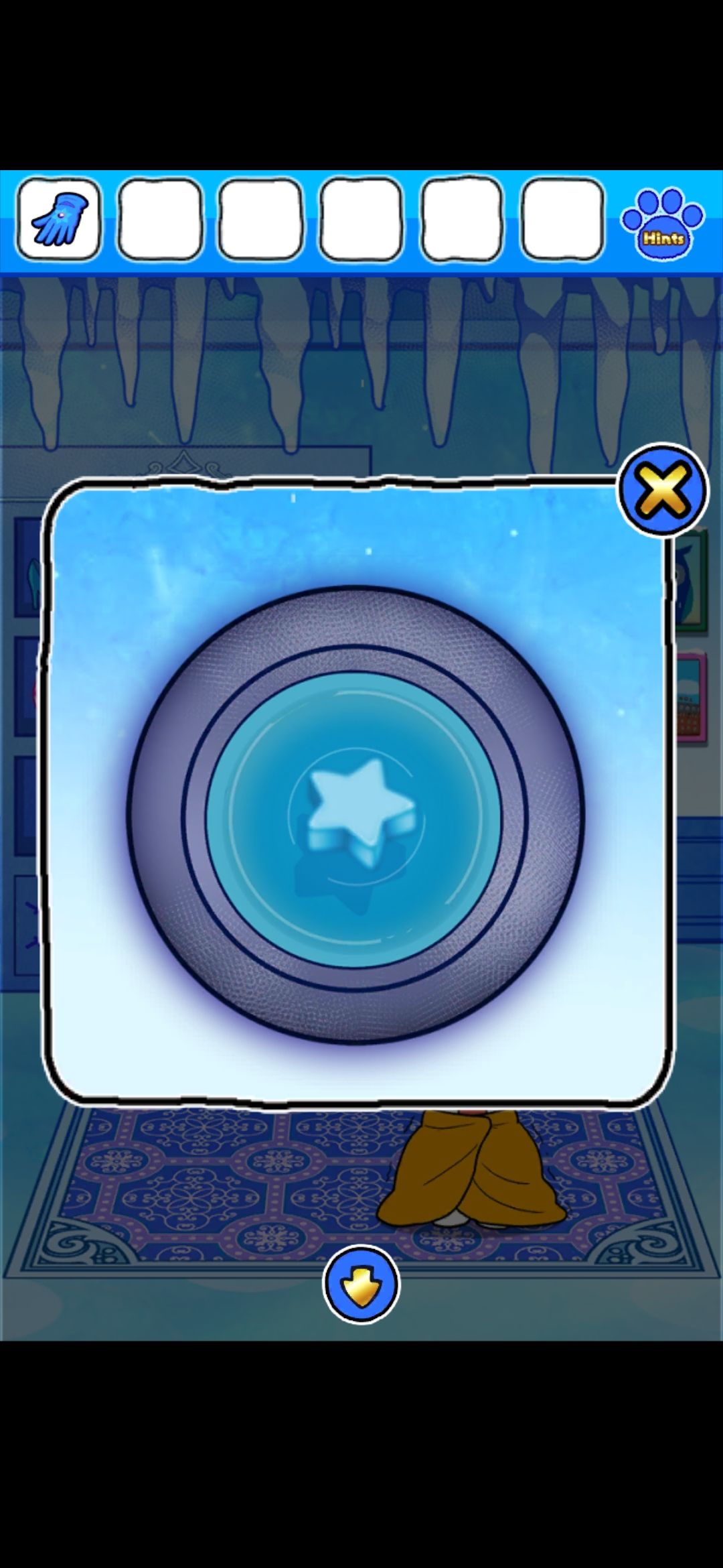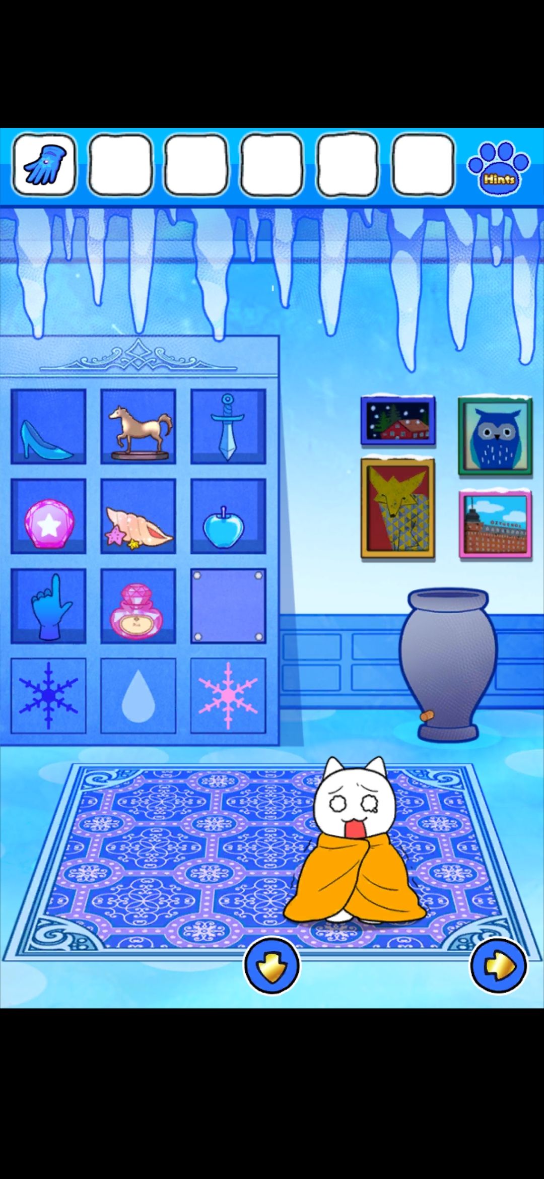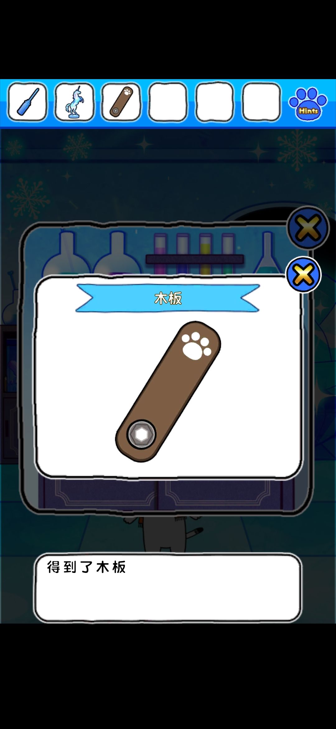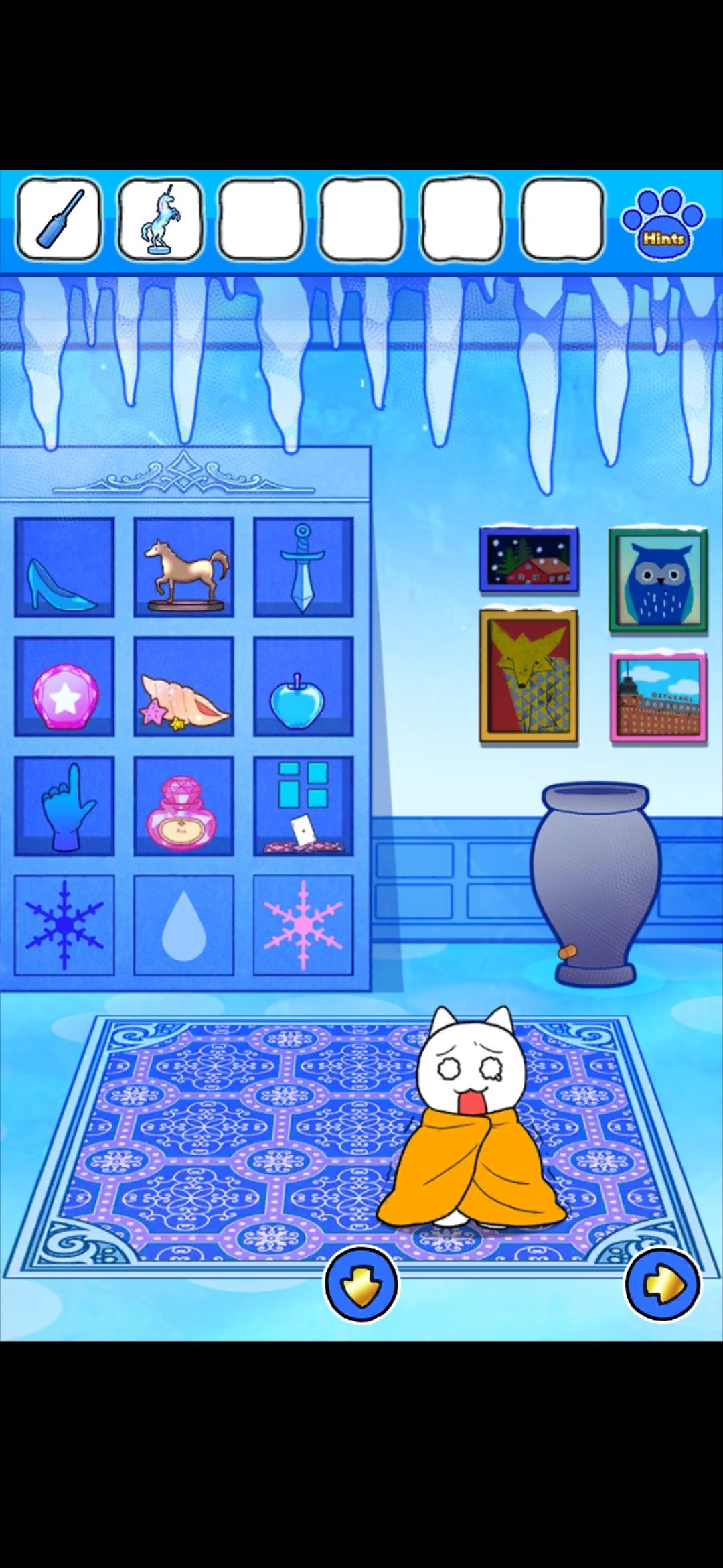 首先,点门旁边的雪花中心的红色按钮,出现凹槽,在镜子界面的雪人可以收集到金色框和塞子,独角兽挂画界面的树上收集到圆形装饰