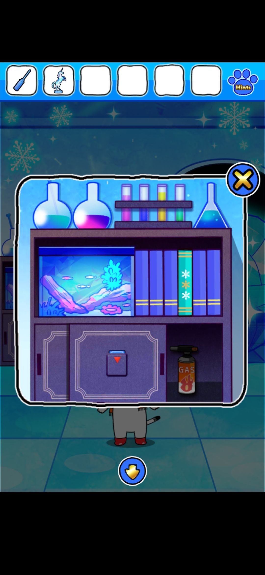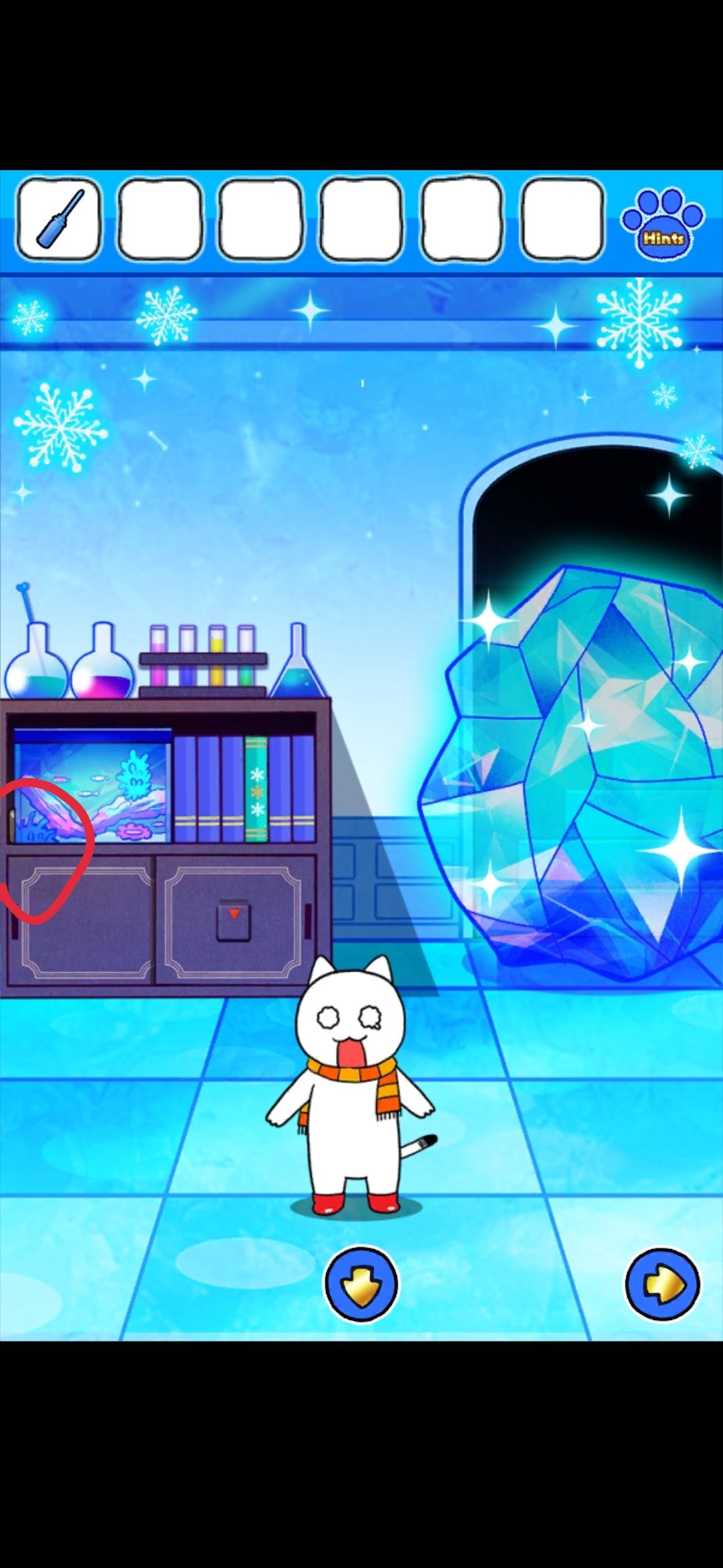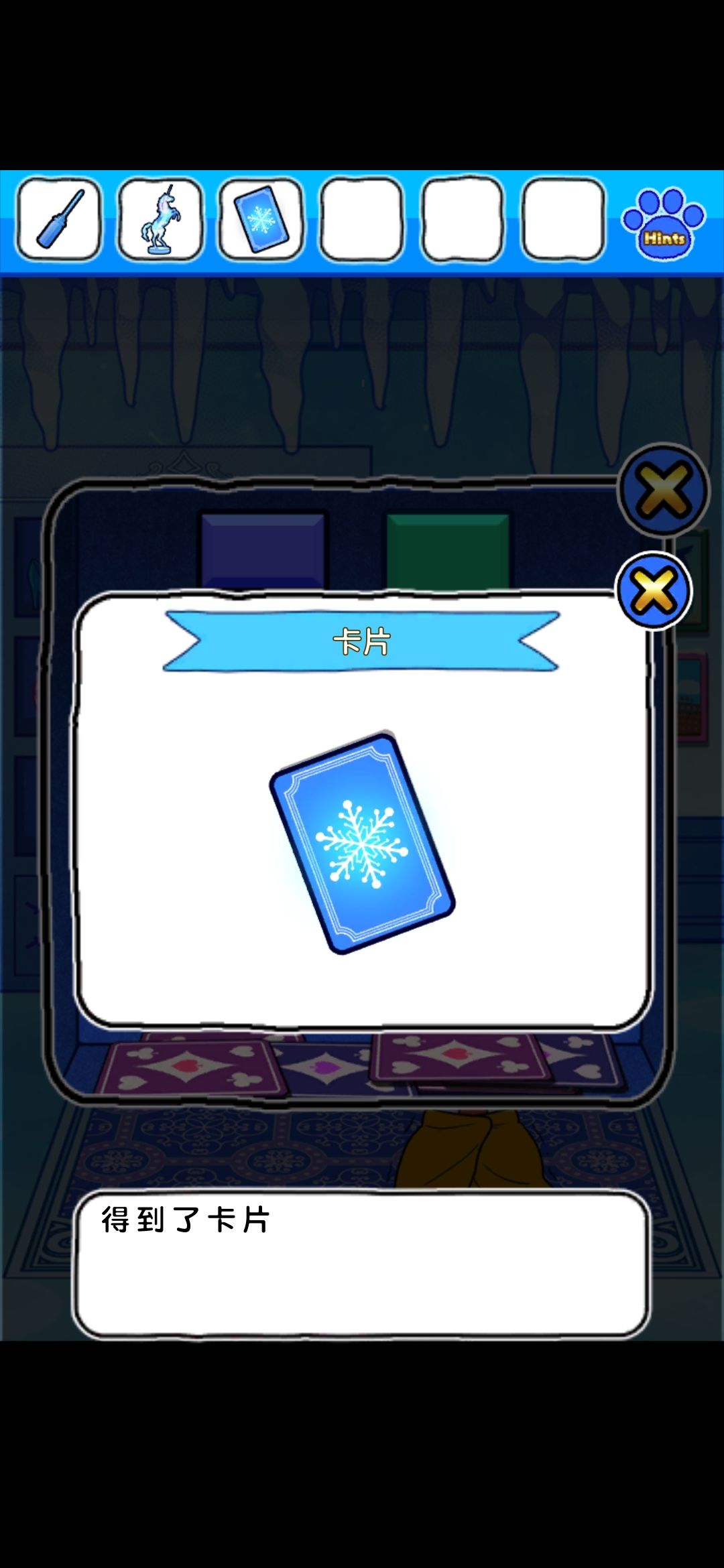 回到书柜界面,卡片插入槽里,得到喷火器,解冻隔壁界面的大黄,大黄会推开冰块