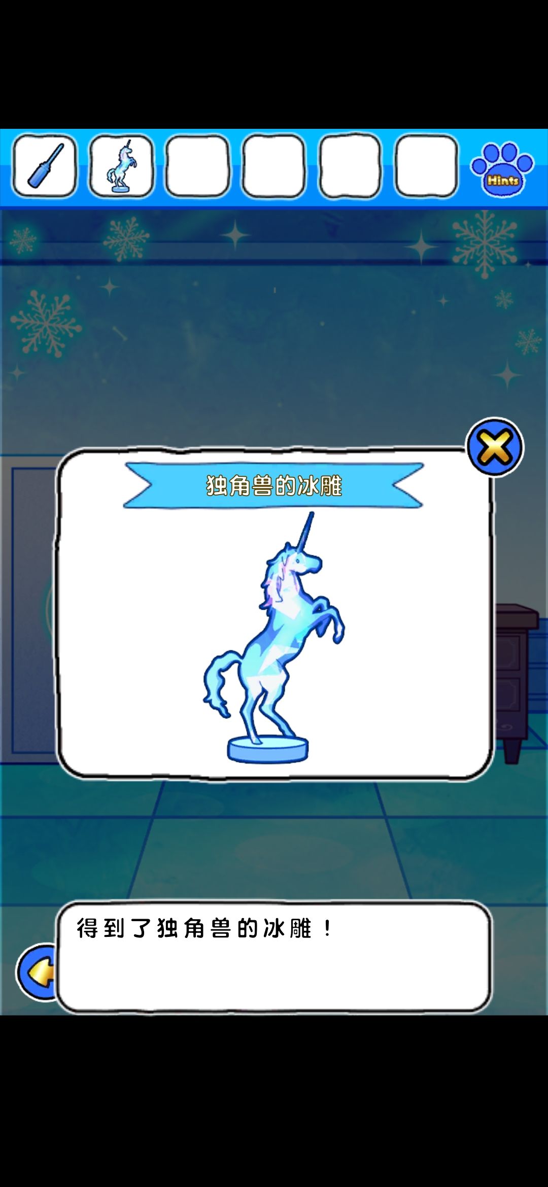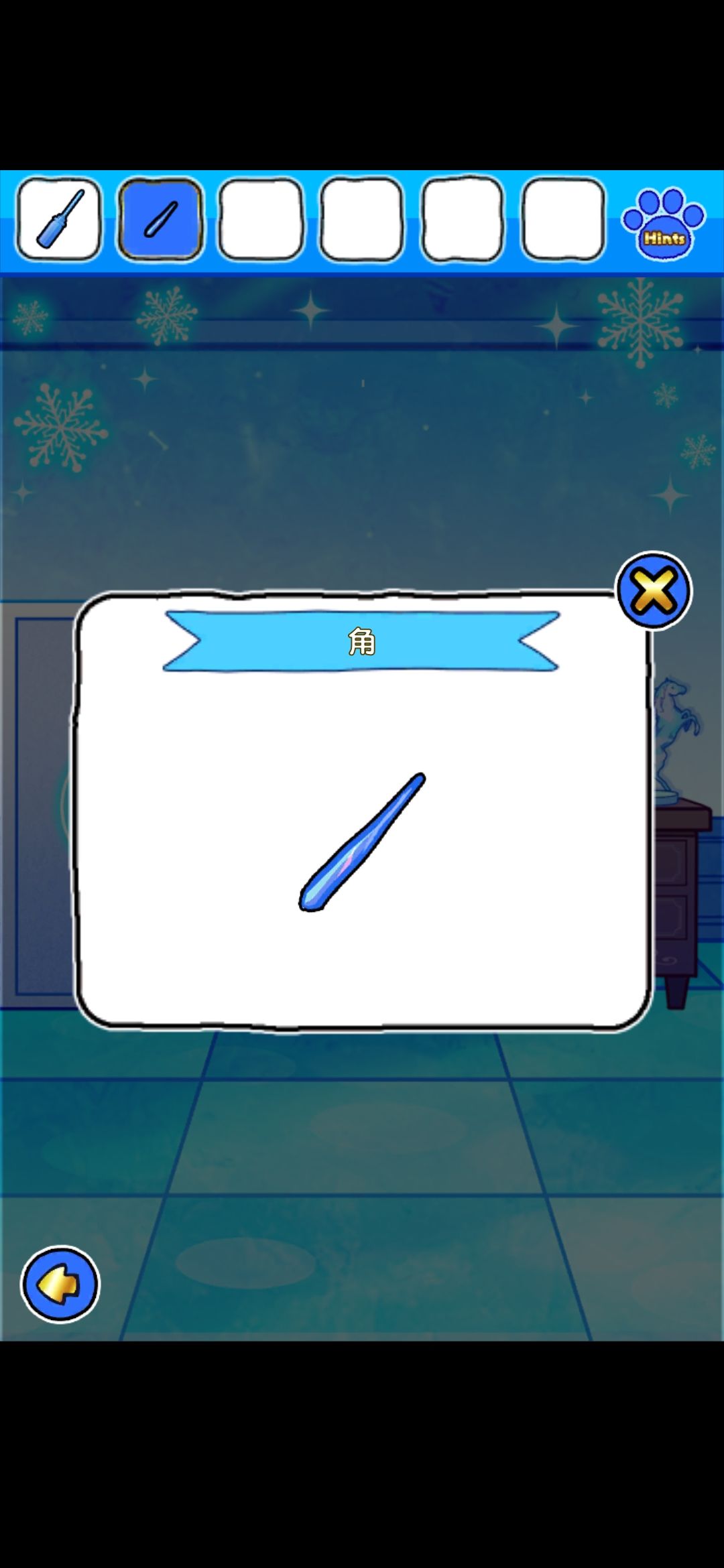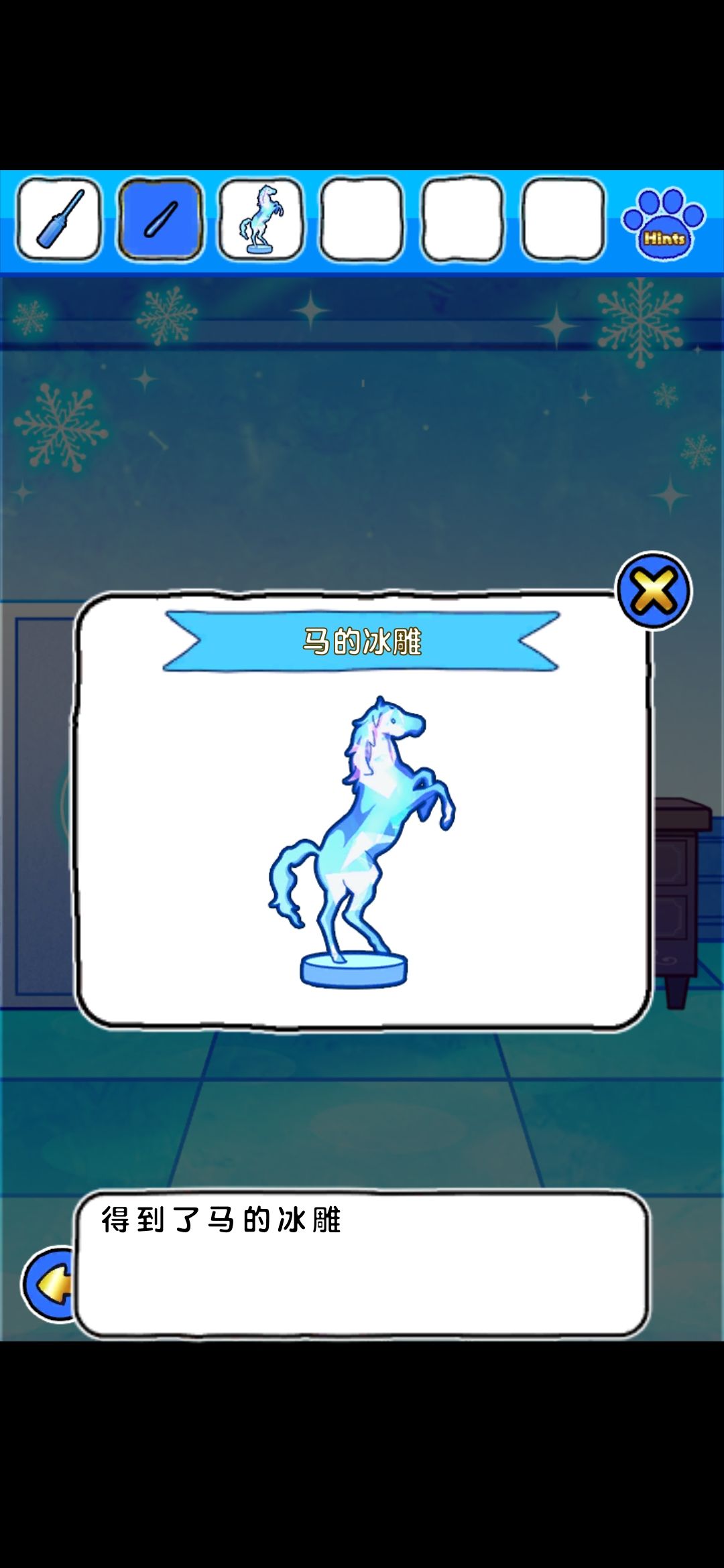 到梯子上层的书柜界面旁边的独角兽雕塑界面,开门得到冰冻的大黄,隔壁桌子角落得到角,桌子上得到马雕塑和线索图,合并角和雕塑