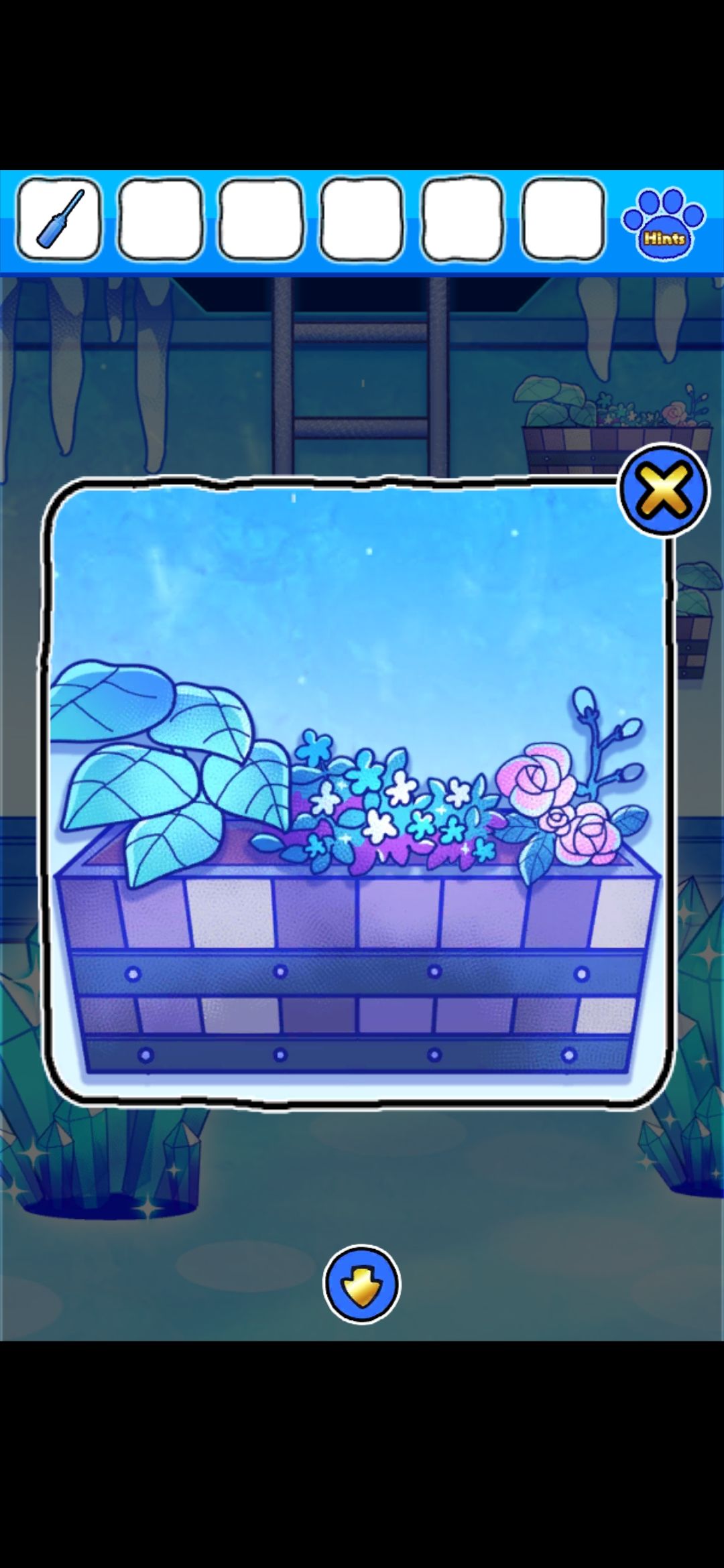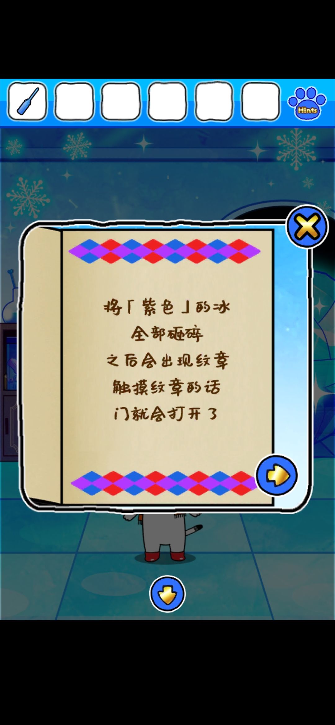 大门界面左侧旗子用螺丝刀打开,并用螺丝刀点红色和蓝色的石头(红+蓝→紫),点击雪花