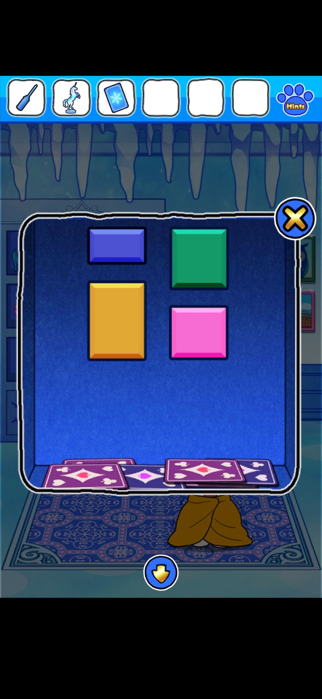 到楼下柜子界面,打开右下角,按右侧四幅画的颜色点方块,得到卡片