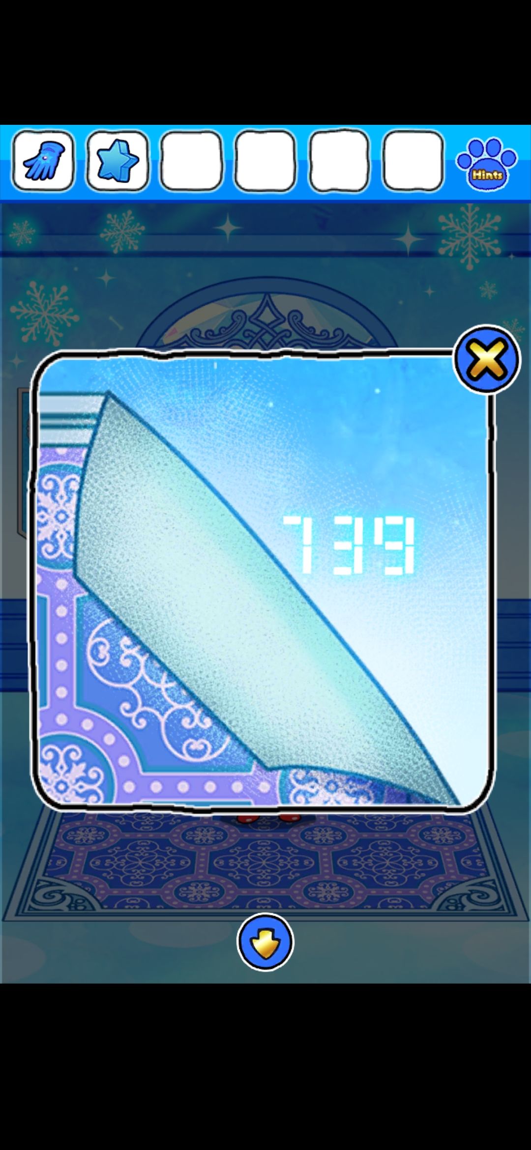 回到大门界面,用手套掀起地毯右上角,独角兽挂画界面,挂画左下角,得到密码5839