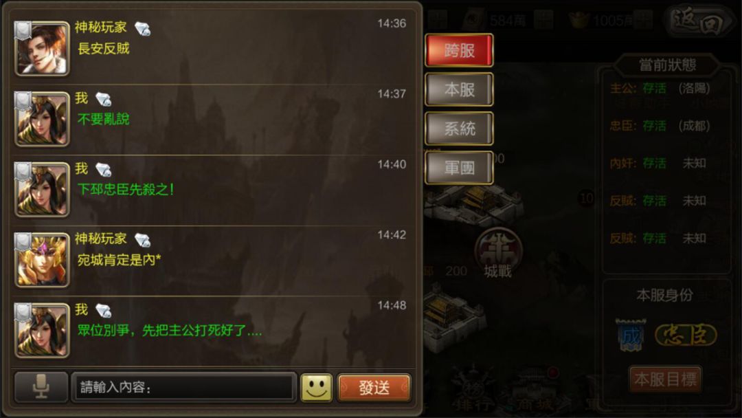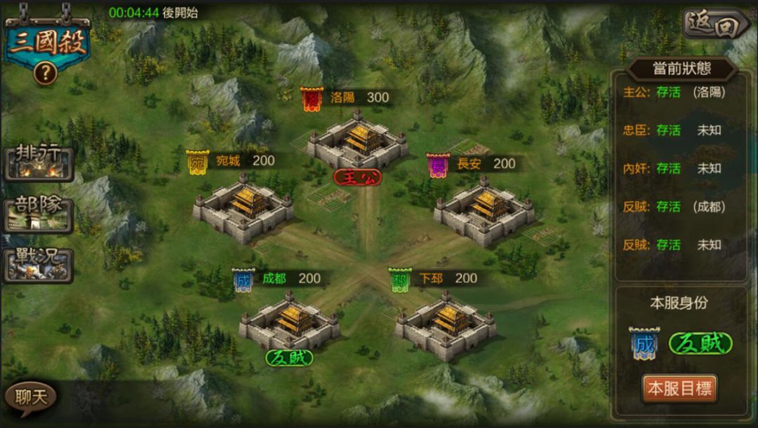 活動正式開放進入後,己方的身份就會揭曉,並分配到各自所屬的城池中。主公所在的位置為「洛陽」,且身份是所有人可見,簡單來說就是謀反者最大的目標!而忠臣、內奸與反賊則是隨機抽選城池,並隱藏自己的身份,在戰力比拚中多了鬥智推理的元素,推敲出誰是要優先擊敗的敵人!