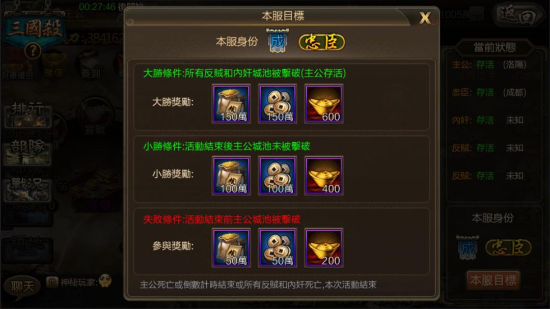 除了活動時間截止外,若主公的城池失守,或內奸與反賊的城池皆被攻破,即判定活動結束,並進行結算。四種身份都有「大勝」、「小勝」與「失敗」三種結果,每種勝負結果的獎勵也有些許不同~例如:所有反賊與內奸消滅,即為忠臣大勝;活動時間結束時主公存活,即判為小勝;若主公被攻破就是忠臣的失敗囉!