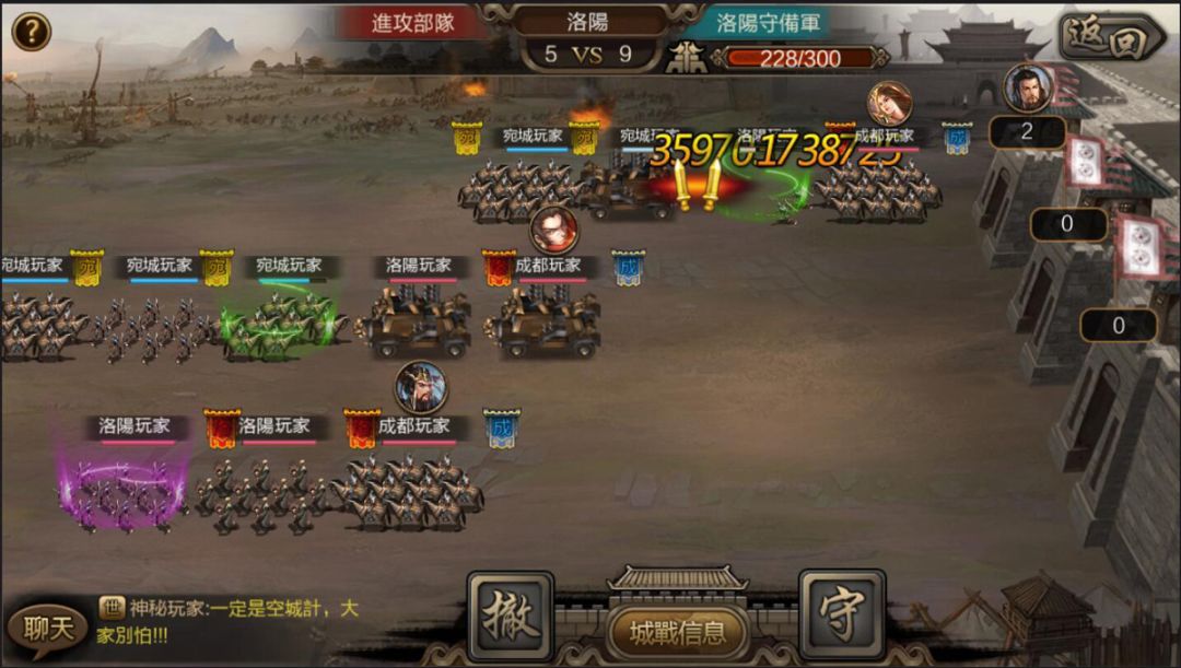 在城戰過程中,主公得保衛自己,並適時派出軍隊鎮壓反賊;忠臣得在最快的時間內消滅內奸與反賊的勢力,降低主公城池的消耗;內奸與反賊得想辦法擊敗除自己以外的所有對手,並保全自己的勢力。當城防軍全數消耗殆盡,即判定城池失守,在主動進攻之餘,可別疏忽了守備隊伍的配置喔!