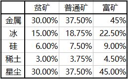 以上是各种单矿星球的矿物含量,萌新的金属消耗量很大,最好选一个至少是 37.5% 以上含量的,挖掘难度不要超过 80 的星球来挖,对于前期的发展非常有利。