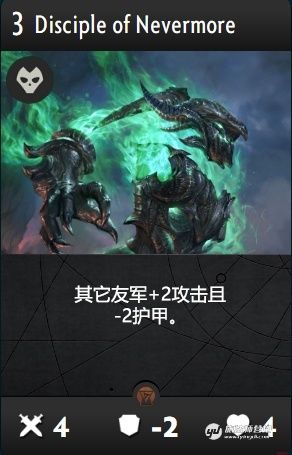 一个黑色小兵,给整条线的友军+2攻,但代价是-2防,不过这个代价相比推塔获胜简直不值一体。如果该线路上还有Sorla Khan的专属增益牌的话,就这两张牌能对塔打出24点伤害。而且如果有冰女在线上的话,你只需要5费就能打出这个伤害,先用4费的法术造兵,冰女被动触发,恢2点法术力再释放这个小兵。