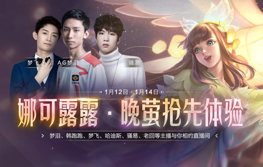 想了解更多这款皮肤的特效细节么?大神主播们将在1月12日在自己的直播间开启直播活动,届时梦泪、梦飞、骚易、剑仙等大神主播们将与大家共同感受【娜可露露·晚萤】的魅力!