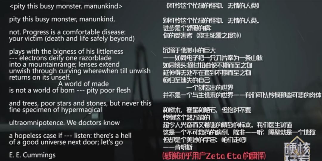 在这首诗中也是各种反语隐喻的方式,对现代社会人们自我膨胀、依靠科技进步失去独立思考的讽刺。游戏呢,也借用这首诗的隐喻也接入了游戏中的两类人研究员与行尸。行尸我们不必多说,他们都被研究员所控制,已然成为了牺牲品。别说独立思考的能力,就连独立思考的权利都没有。而研究发现了某种可以对人类实行心控的技术,于是肆无忌惮的大规模的进行这种非人道的实验,他们只会遵循着这套思考继续,来获得更大的利益。从某种意义上来讲,他们也与他们所控制的行尸一样,都失去了独立思考的能力。
