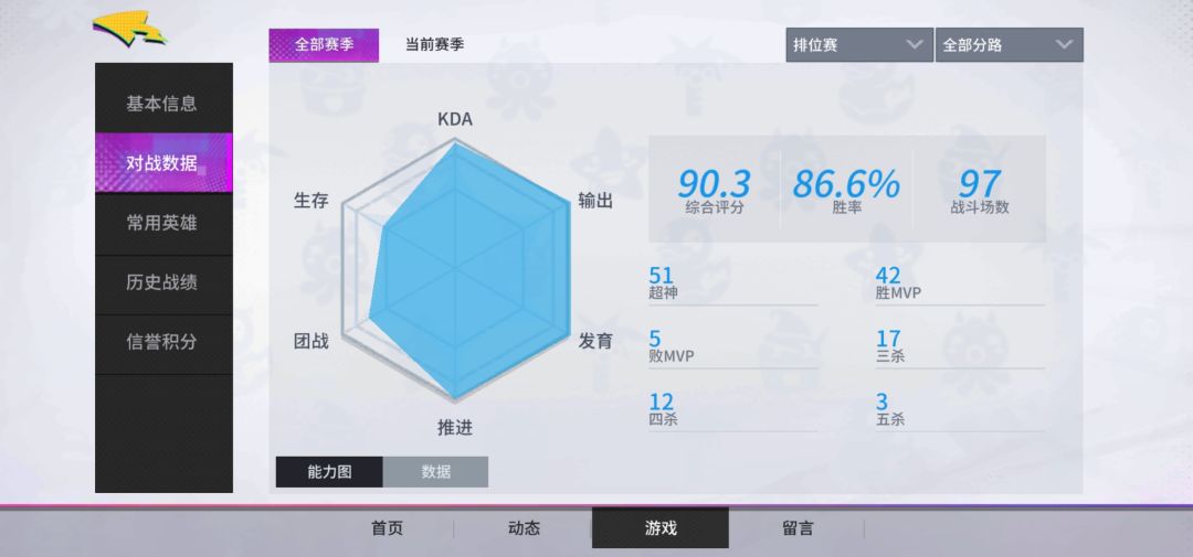 近百场86.6胜率传说,不得不说技不如前了(其实是现在强势英雄太多了)顺带一提,新应援FFF团长真的很强!刺客打野必带!其他和以前没什么区别。