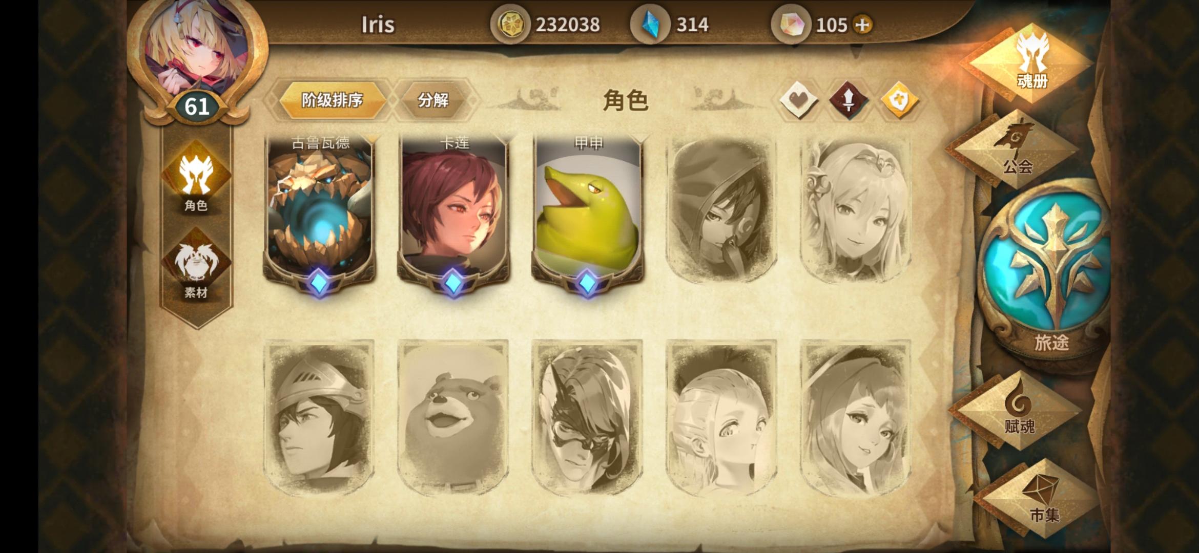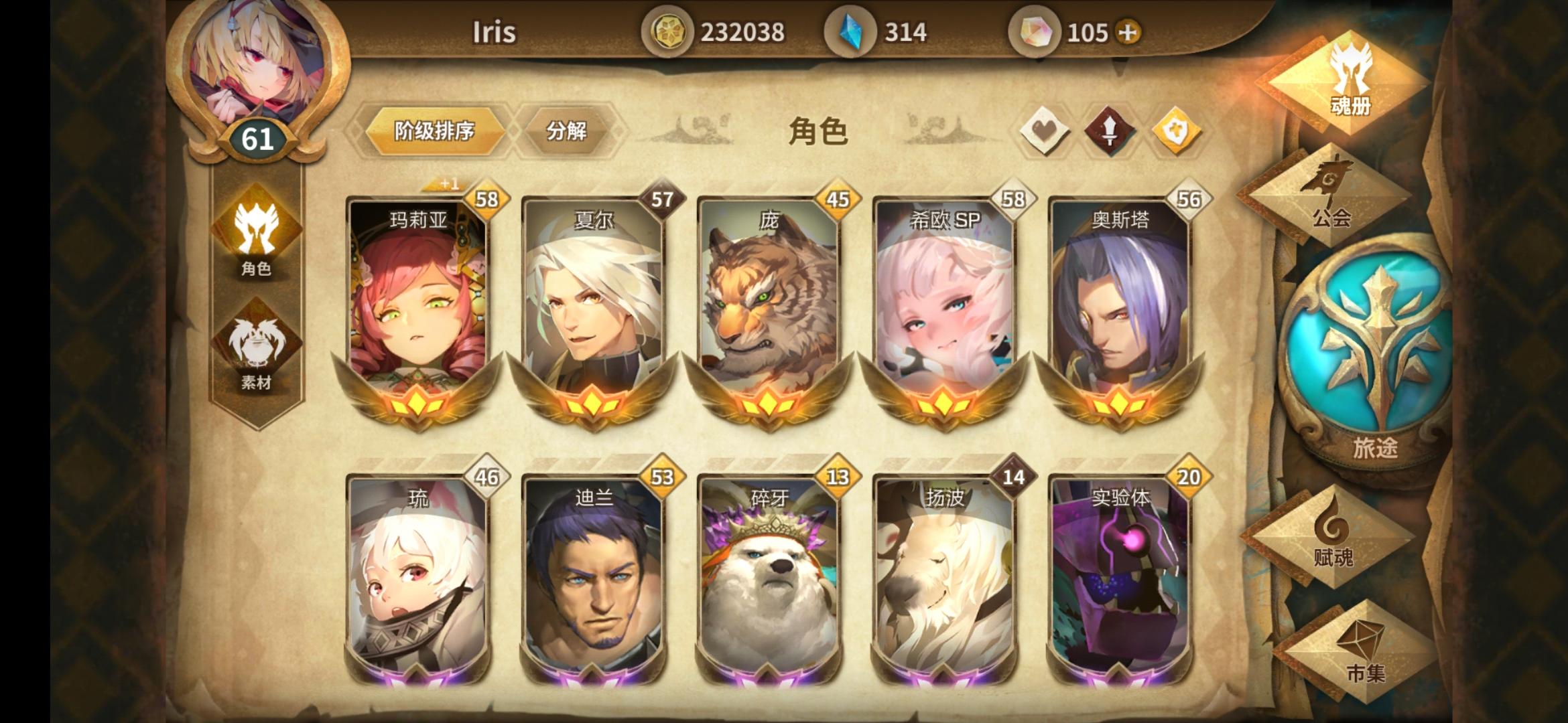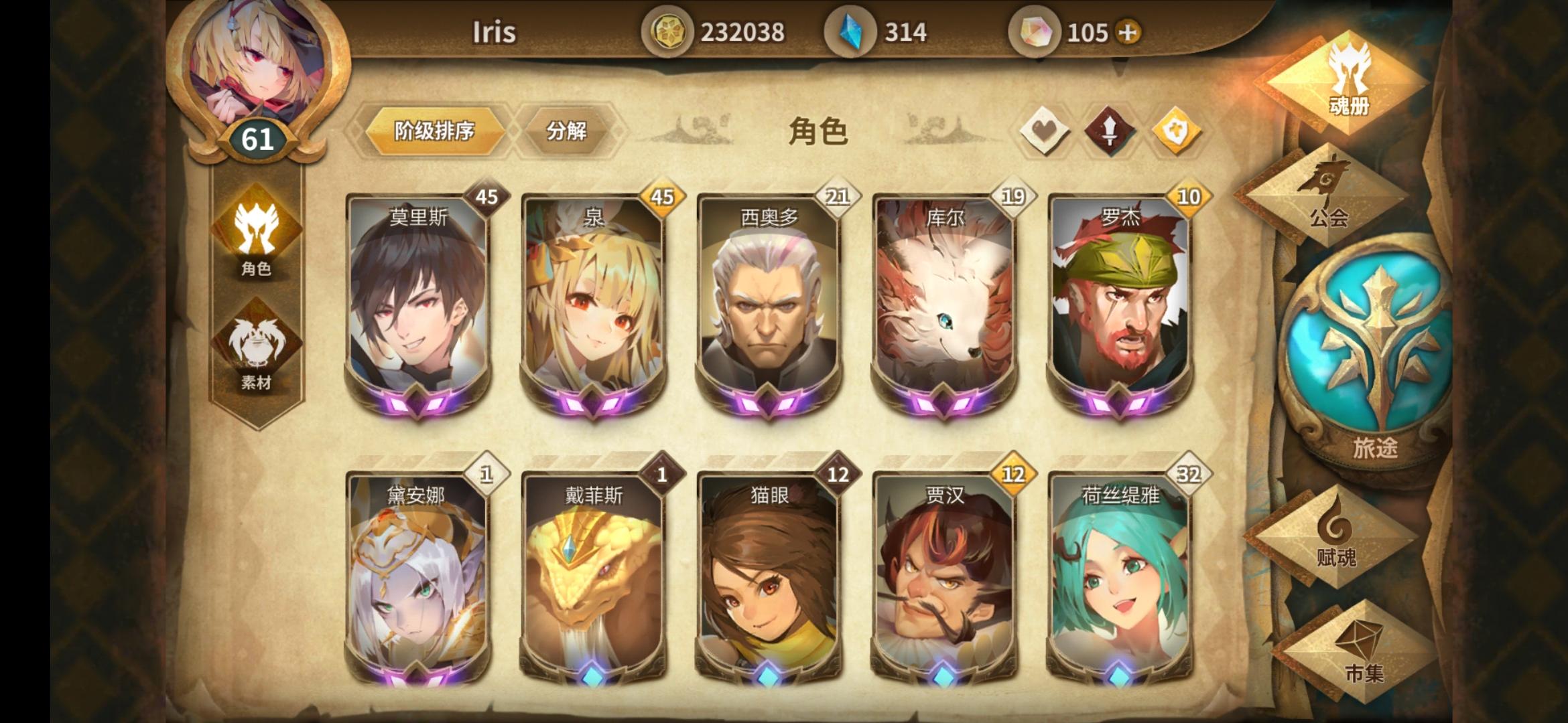 如图,手里的角色有这些,玩的时间也有两个多月了,之前加的公会因为活人太少所以退了,每天都会刷幻境,公会任务也会尽力去做,希望来个公会收留我