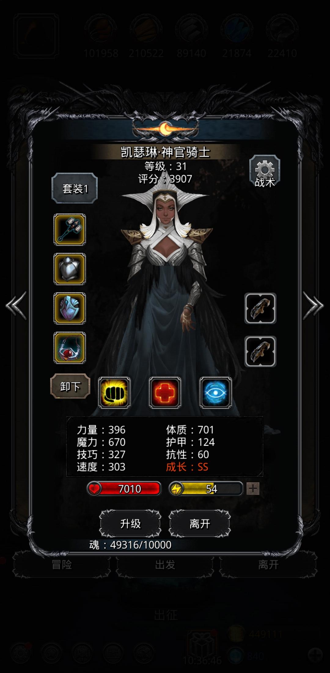 本人萌新,入坑一个月,过图14,锻造25,之前一直卡在裂隙30,每天都在23收菜,看了很多大神大佬过裂隙30的帖子,但是自己配置不行无法按部就班,自己研究了一下,用现有的装备过了30-33,如有改进之处请指出,下面是我的队伍配置,技能配置如下:法师30-32层1%治疗队友其它全关,33层随意;夜莺全开(本人无夜魇);神官骑士30-32全程手动加法师和教宗的血,嘲讽不断,33层自动;教宗100%治疗,攻击全关。最后说明一下34小怪勿碰,本人第一次上34层未开水晶小怪翻车,后来重新爬上去。