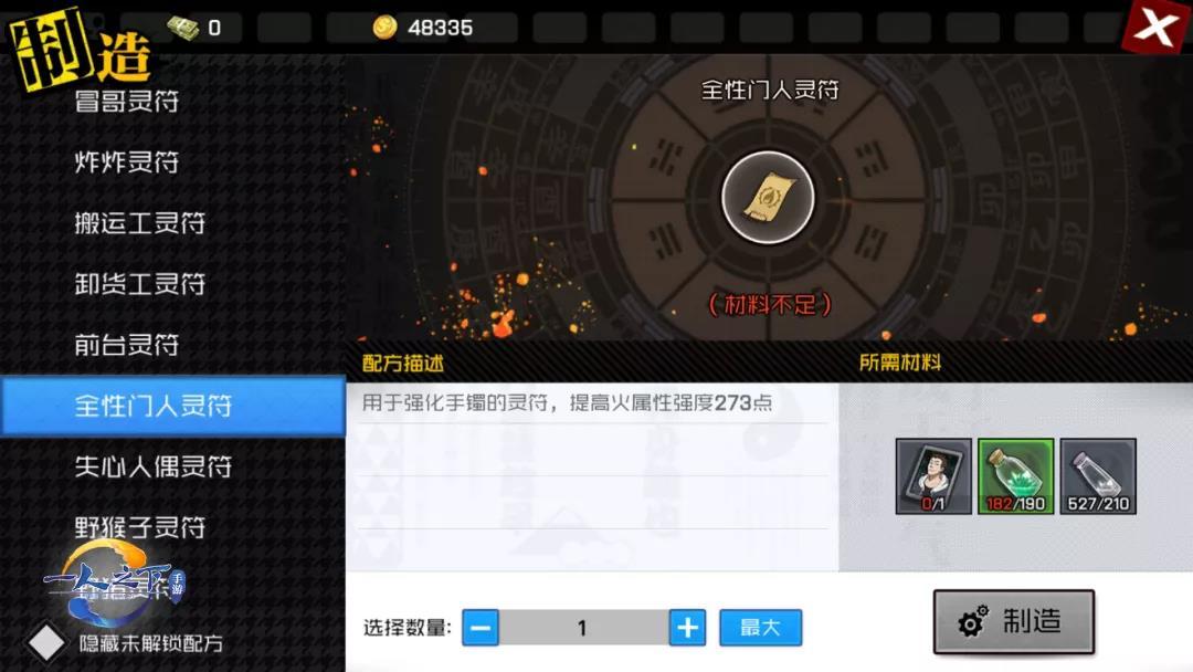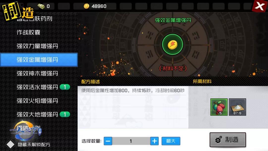 如上图所示,制造系统可制造出补充血量&增加力量的药品、提高武器属性的灵符。制造不同道具所需材料都会有所不同噢~
