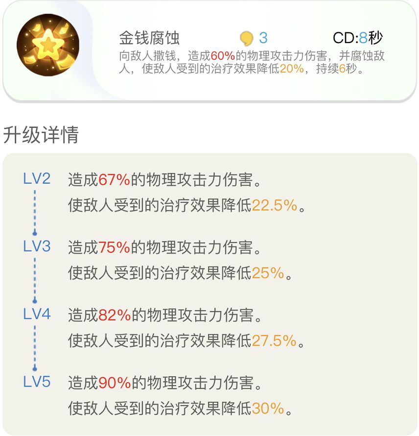 向敌人撒钱,造成60%的物理攻击力伤害,并腐蚀敌人,使敌人受到的治疗效果降低20%,持续6秒。