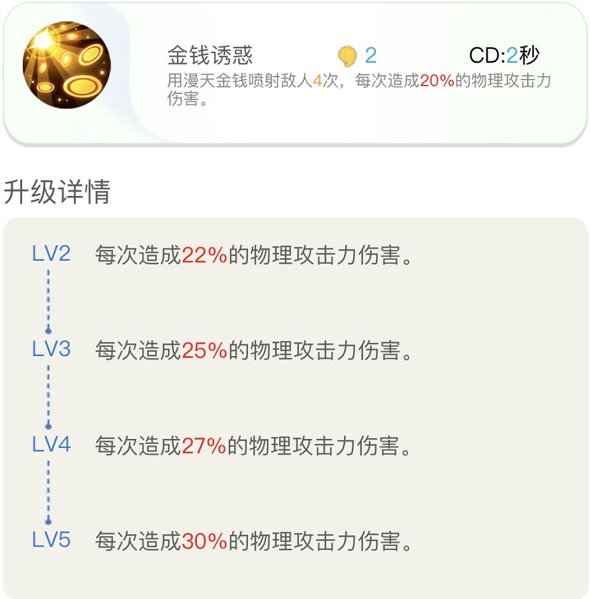 用漫天金钱喷射敌人4次,每次造成20%的物理攻击力伤害。
