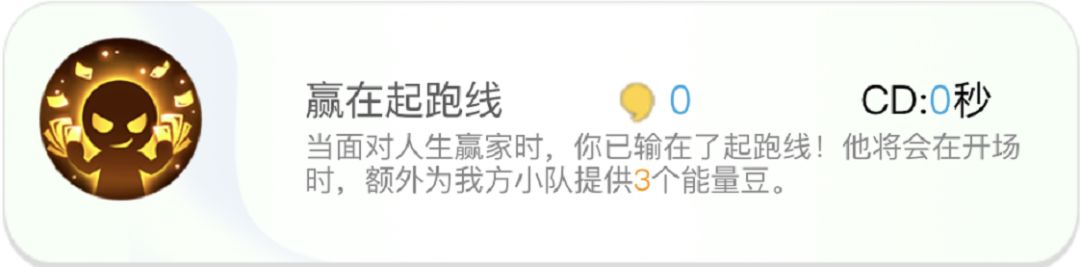 当面对人生赢家时,你已输在了起跑线!他将会在开场时,额外为我方小队提供3个能量豆。