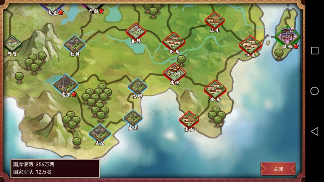 地图按汉宣帝的,初始拥有益州(原剑南、夜郎),滇池改成南中,剑南可以直接打南中,山南改成荆州,江南、岭南改成扬州,交趾改成交州,长安改成司隶,陇右改成雍州,楼兰改成凉州,山东改成兖州,九州改成徐州,河南改成青州,河北改成冀州,河东改成幽州,雁门改成并州,辽东不变