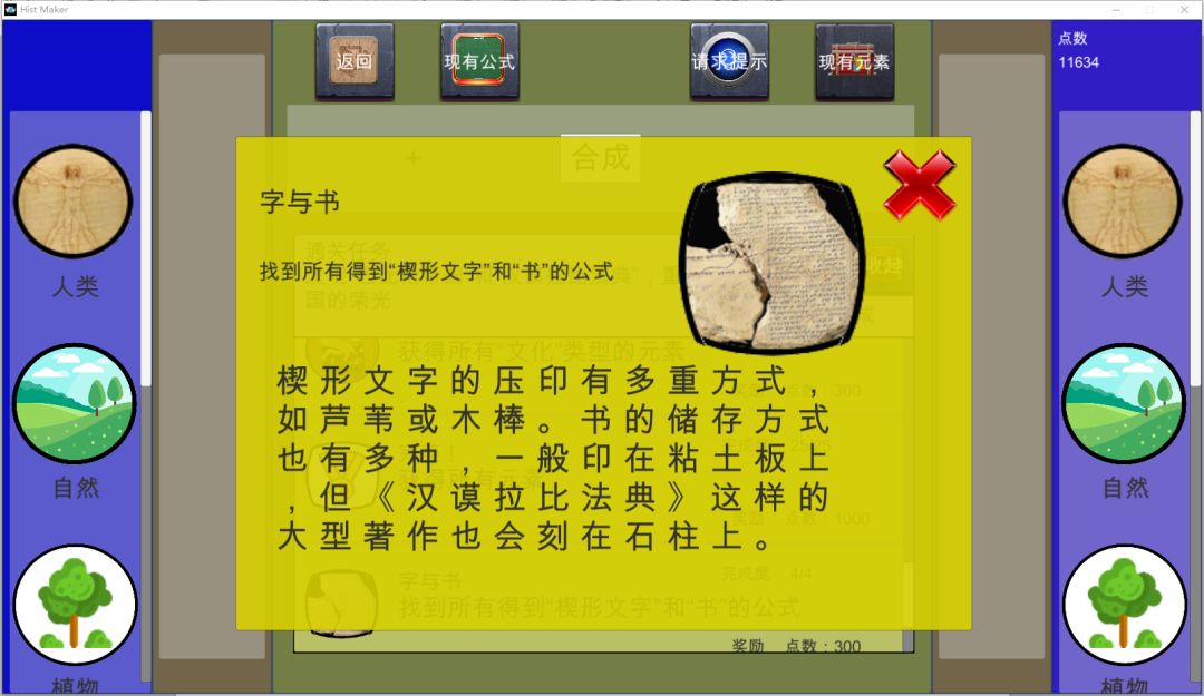 A:虽然前期关卡大多合成公式都是这种简单并且通过常识就可以接触的。但是随着关卡的推进,你甚至需要去得到古埃及战士“美尼斯”或是古巴比伦的“汉谟拉比法典”,甚至是中国上古君王颛顼的功绩。所以玩家通过元素合成在关卡中探索可以学到知识,另一方面,过关期间每个公式、成就都会存在不少相关知识介绍,有兴趣的玩家也可以进一步了解相关历史知识。
