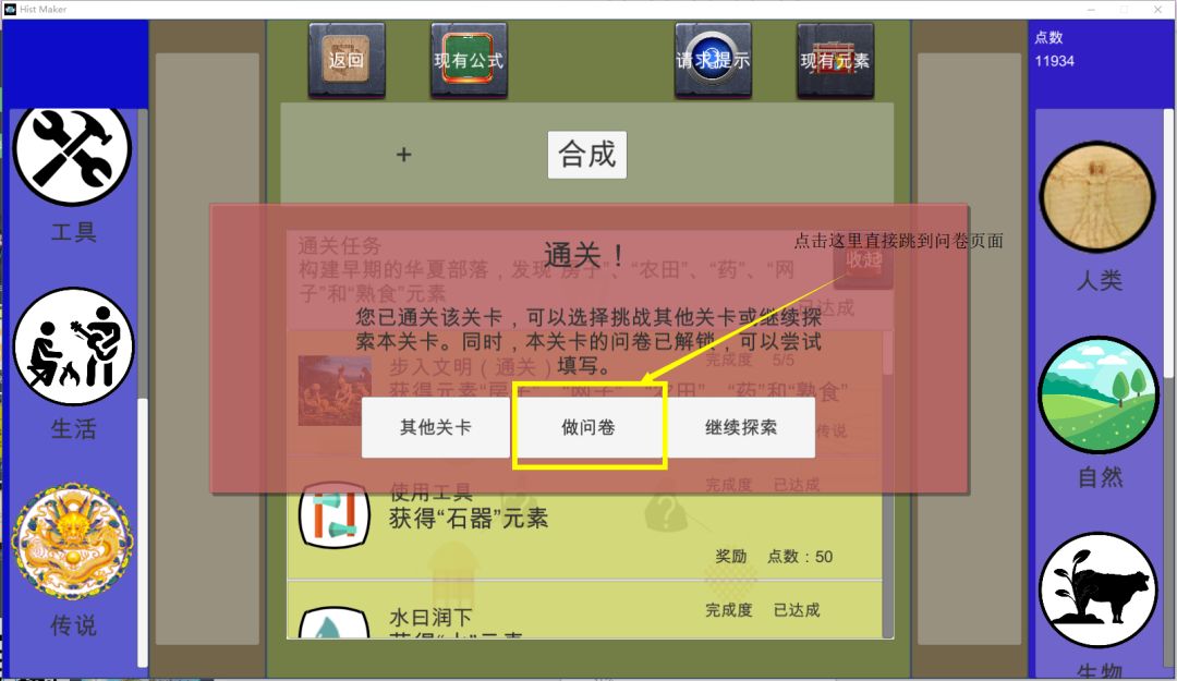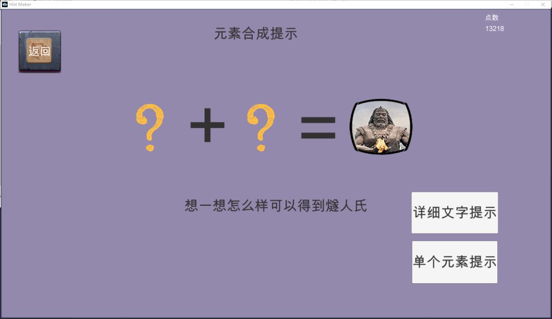 Maker》和他们还是有相当大的区别的。首先《涂鸦上帝》这类游戏的驱动核心在于玩家对于任意元素的随意组合、探索,因此随着得到的元素越来越多,组合的可能性呈平方上涨,最后玩家只得大量枚举或是翻看攻略才能继续。而《Hist Maker》则以关卡为划分,将元素控制在一定范围内,并以成就和通关任务为引导让玩家有方向的思考、解密、合成。其次,即使《涂鸦上帝》也有关卡式的副模式,但总的来说玩家在整个游玩过程中仍然几乎没有什么特定的目标,只是随意的尝试组合,并在突然发现的新元素中获得惊喜。而《Hist Maker》则将引导和提示放在相当核心的地位,也正因此玩家可以不花费点数就可以看到目前还能什么元素可以合成。总的来说,在这里探索、尝试是游戏中的“辅菜”,而不是《涂鸦上帝》中“主食”的地位。最后,《Hist Maker》中玩家所遇到的卡关-学习-思考-解谜的整个过程在《涂鸦上帝》中几乎不存在。