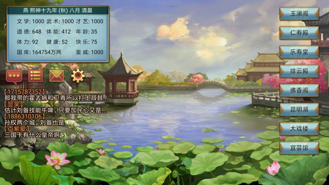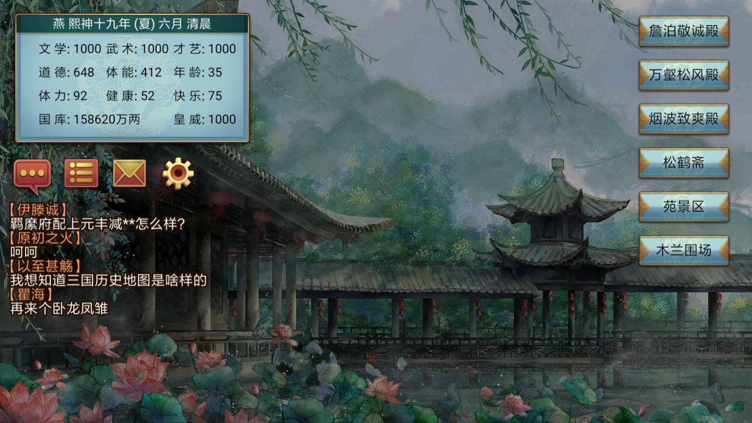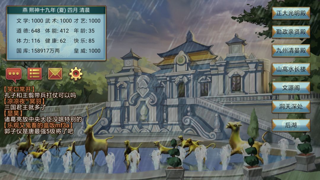 建好圆明园,颐和园等园林后,在养心殿去出游,本以为是随机来点属性就结束一个时间段的效果,谁知道竟然换背景了。。。。。😂😂😂😂😂不过还蛮好看的(紫禁城看腻了)