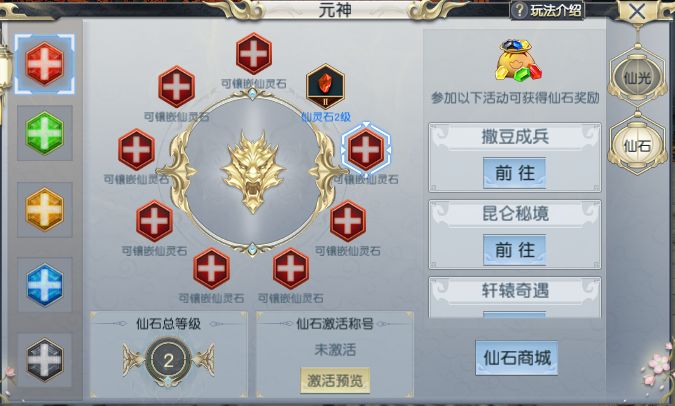 仙石开启条件为角色等级达到50级。仙石分为仙灵石、仙魄石、仙蕴石和仙玄石,分别对应红、绿、黄、蓝、黑五种颜色,每种仙石对应一种属性,镶嵌后可以为角色大大的提高属性。