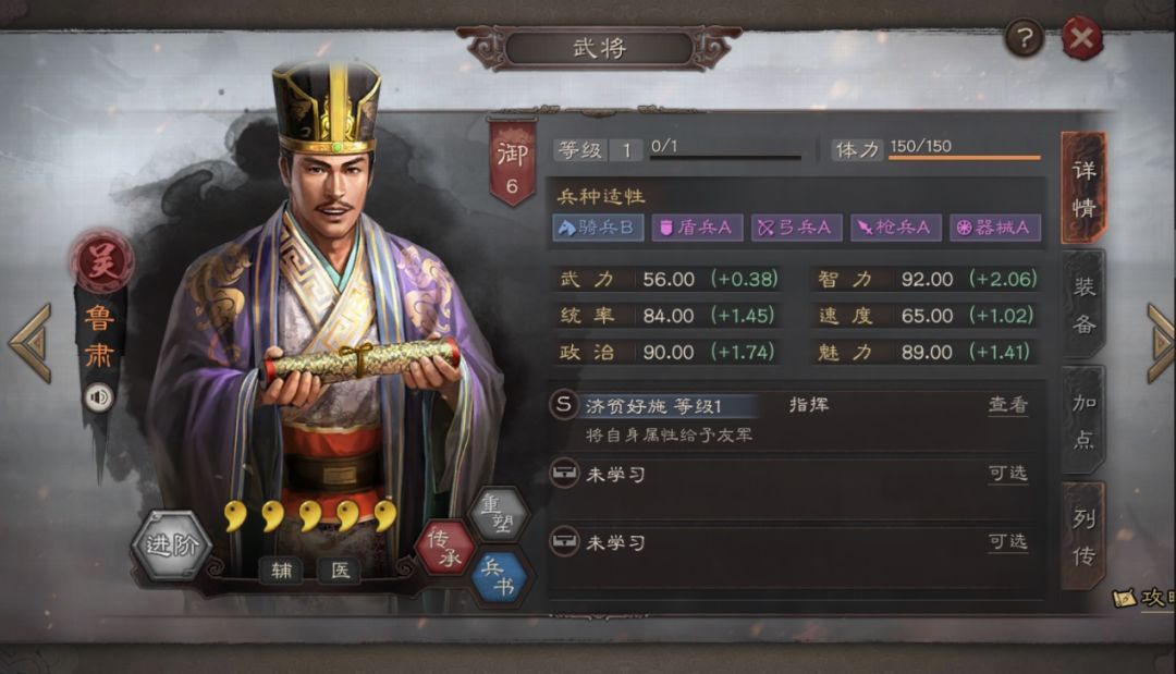 鲁肃带来了新的战法,将自身的属性移交给友军。这一战法十分有争议,首先50级的无装备的鲁肃面板智力242.94点,进图后有着10%国家属性后,智力达到267.23,其40%的智力为106.9点智力值,而自己的各项属性只有原来的60%。鲁肃自身能力值由于兵种A适性不能享受1.2倍加成,在给予属性后伤害能力(智力将十分依赖智力差)不值得期待,所以更适合携带兵种,或是指挥类战法协助友军作战(指挥类战法效果只受准备阶段智力影响)。可以看到的是,济贫好施在第3-5回合有一个类似于刮骨疗毒的治疗效果和一个不错的减伤,意味着嘟嘟队伍以后除了打快攻迅速击杀敌人外,还可以走偏防御的路线。列传有东吴大都督,如果是配入都督体系中,可以构成周瑜、陆逊、鲁肃组合,来增加其他两人的智力提高其伤害。虽然如此,但是由于身板脆,容易兵力损耗过高,不擅长持久战。