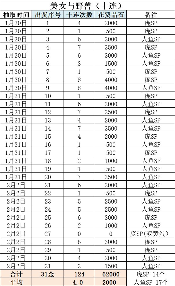 124发十连,共花62000石,出货31金,平均4发十连出货,平均成本2000石,平均出货率2.5%。其中庞SP14个、人鱼SP17个