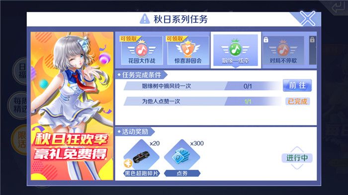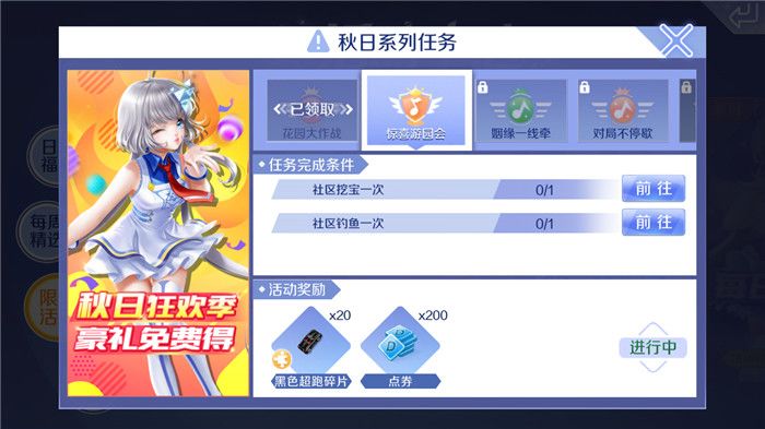 每天的秋日任务又包括两个小任务,每个活动任务都非常简单,比如在花园大作战任务中,在花园中播种一次、收获一次就可以完成花园大作战的任务了,在这里告诉大家一个小秘密,在花园中种植满天星所需要的时间是最短的哦!在惊喜游园会中,需要在社区进行挖宝一次、钓鱼一次就可以完成任务,这个任务也是大家在日常要做的事,所以非常轻松地就可以顺利完成了!
