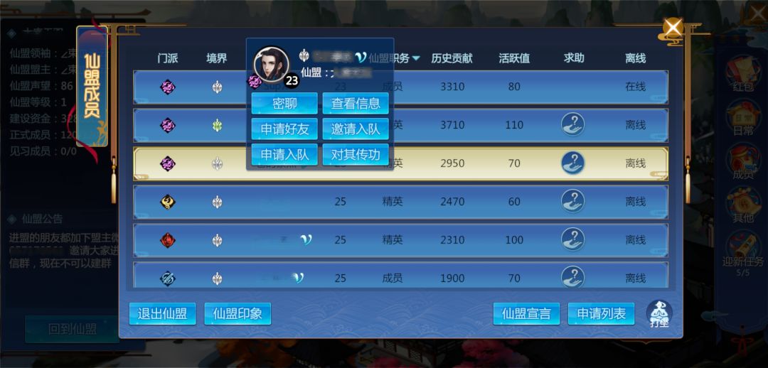 仙盟中有丰富多彩的日常活动,加入仙盟之后,仙友可以和盟友一起互帮互助,并肩战斗,领取丰厚的活动奖励~