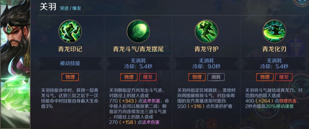 关羽将斗气凝结成青龙刀,对范围内的敌人造成150(+50.0%物攻加成)点物理伤害,2秒内提高10.0%移动速度。