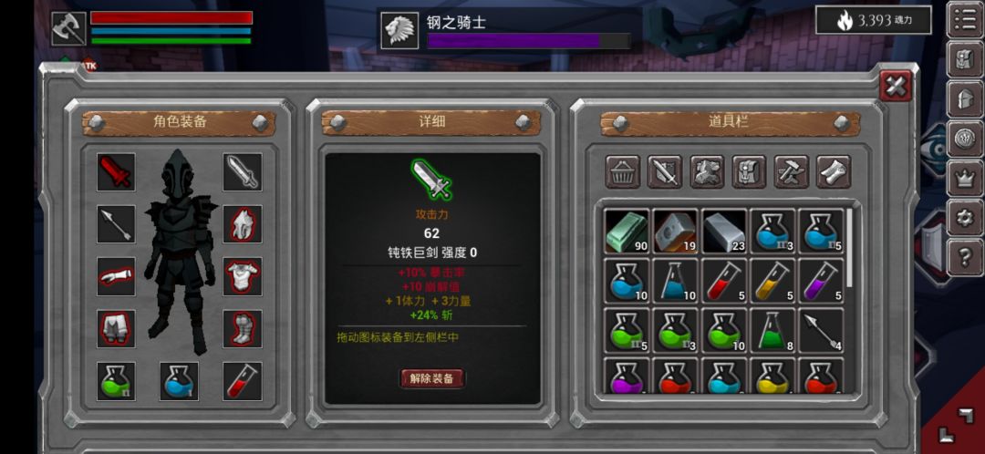 所以,钢骑重剑在33.3%-19.8%≈14%斩的基础上,高攻击力,高力量的优先考虑。