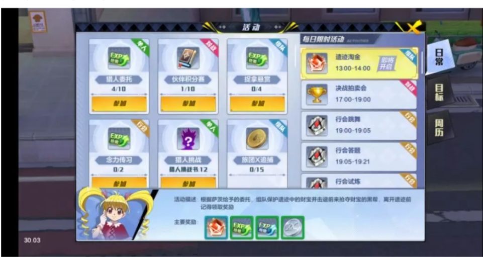 点击【活动】按钮,我们在“每日限时活动”部分可以看到遗迹淘金这一活动。需要注意的是,遗迹淘金属于限时活动,将会在每日的13:00-14:00开启,所以猎人们可要抓紧时间别错过啦!