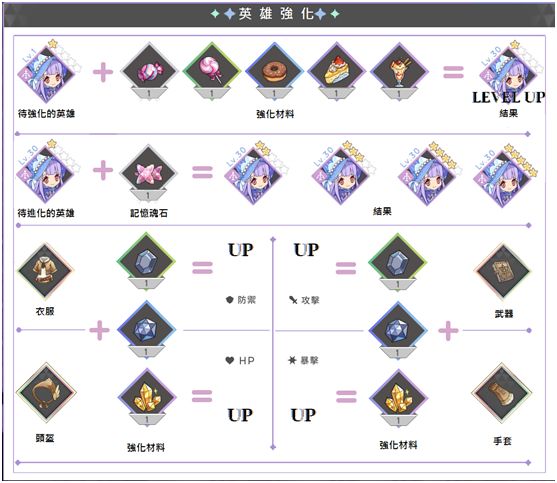 (1)英雄升級:使用甜點類型的強化材料對英雄進行餵養,可以獲得大量的經驗值。