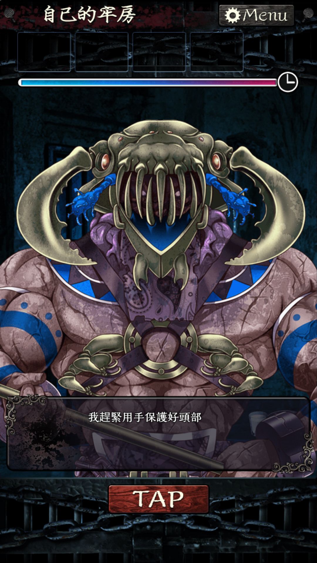 点击等待看守,看守进来,你很紧张,所幸守卫并没有发现什么,等它出去,你将马口夹从马桶取出来继续锯门,