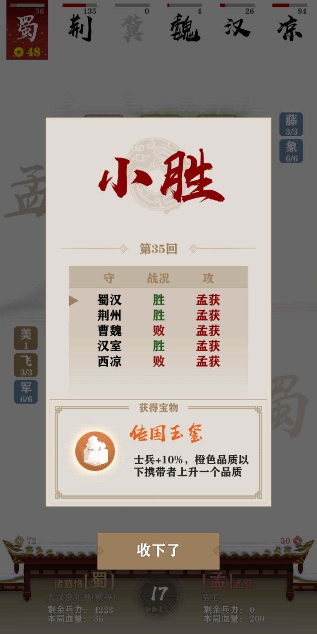 二、再攒50块,重复上述过程,此时改为阶段性刷卡(50块钱吃利益,每回合可有约20块钱,保证刷两张有用卡,或一张关键卡,或一件关键装备),提升质量,在打孟获(第一个出紫色装备)的时候sl出玉玺(需要通过广告),给到三阶前排。此时阵容最低全二阶。