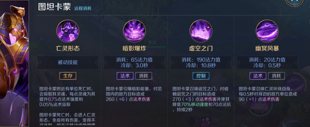 图坦卡蒙附近有单位死亡时,会吸取其灵魂,每点灵魂为其提升0.75点法术强度和0.05%法术汲取 图坦卡蒙死亡时,会进入亡灵形态,免疫所有伤害,变得不可选取,但无法移动或使用曙光战技,持续8秒。