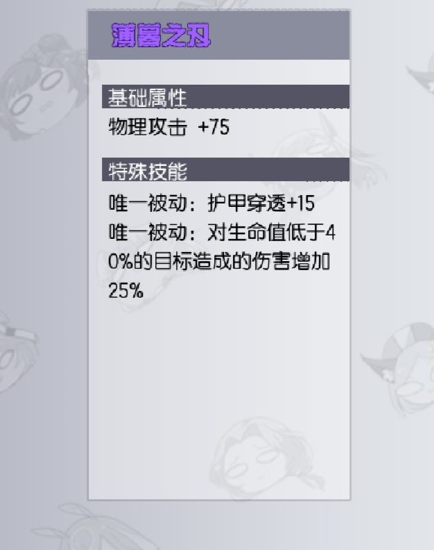 首先,薄暮在给予75伤害的前提下又增加了15的穿甲,这些加成对于一个战士或者刺客来说都是必须需要的加成,拥有着物理装备最高的75攻击加成以及15穿透的前提下,薄暮还有一个最为关键的被动。 那就是对于血量低于百分之四十的单位伤害提到百分之二十五,记住,是单位,不是对英雄而言,而是所有玩家可以攻击的目标,伤害都增加百分之二十五,这样以来,刺客在出完这件装备后,在前期收割可以说毫不费力。 而为什么说射手也可以出这件装备呢?你想想看,在对方和你都残血的时候,双方的攻击一个是没有提高百分之二十五,另一个攻击提高的百分之二十五,那种概念就相当于以前的炮兵打你一下和现在的炮兵打你一下,伤害有着本质的差距(当然,如果对面欧到刀刀暴击,而你十下八下不出一刀,这加成。。。当我没说) 这里顺便说一下,最适合出薄暮这件装备的射手,就要有请我们一开始被喷成狗的小鹿-希尔薇,咳咳,希尔德选手出场。 希尔德的一技能是所有射手当中唯一一个远距离给予对方伤害的英雄,在不出薄暮的情况下,对手残血一旦被希尔德的标枪击中,那么可以说出一句“唔买也,摸辛得以卢”一句中二到爆的话收下一血。 但是,情况就很突然,万一这时候人家点个回复,万一人家A了一下兵或者野回了血,这到手的人头岂不是消失不见了吗?所以,希尔德出了薄暮后,那不单单是75攻击的事情,后期一旦血低于四十,哪怕到四十这个点上,触发薄暮被动,一个一技能就是一个人头,而且可以安全的收下,这也是为什么最近排位经常见到希尔德的原因。 而刺客,这里就不需要多说了吧,谁家刺客不出薄暮呢?前期狗头不是很舒服的一件事情吗?别管其他人能不能发育,你发育起来了,还怕其他人发育不起来吗?(雾) 战士出薄暮的典型就是我们的大姐头伊莎了,开团利器的伊莎出完薄暮后可以轻松的收掉脆皮人头,搭配着自己出的烧甲,也可以出发薄暮被动,让伤害提高。 所以上一期说的阿库玛,你要是出个薄暮配合阿库玛被动,岂不是可以让烧甲打出更高的伤害吗?自己说不定也可以在团战之中拿取一个人头,可以说是最完美的打算了吧。 说了这么多,你们可能会问,这种事情大家都知道,我还特地写一篇帖子,不是纯属浪费大家时间吗?这里就要讲究一下毒瘤玩法了(笑 法师,是一个委屈的位置,毕竟300的刷兵速度那是相当的快,就算你出了鞋子,刚跑到其他路支援,就丢了一波兵,而且中路经常团战,自己的兵线又不抱,当自己去其他路吃兵的时候,中路一塔又丢了,是不是特别真实。 打团明明是自己打着最高的输出,最np的控制,原以为可以自信的看着自己的战绩骄傲的说自己是中单法王,但是一看战绩助攻突然就多出来了许多个,这是不是很真实啊?。 而这时候,薄暮这件万能的装备就出来了,你们先别急着喷我啊,听完自信分析分析,然后在喷也不迟,对吧。 当前版本,法师出装无疑是雷杖,CD鞋(法穿鞋)死书,巫毒,法穿杖,出完这些后,就没什么可以继续出下去的装备了,此时就该疑惑,我到底应该出什么装备的好,你说出法吸吧,这又不是人人都可以出的,你像飞鸟这种可爱的法师就出不了这装备。 此时的你,正在犹豫要不要出个脚链保保命,脚链这件装备给予的护盾也不是很少,而且CD还短,比血手不知道好了几倍,但是呢?法师迟早要没蓝的,而且现在的版本,你脚链刚出来就被打爆了,这玩什么啊,这还玩什么,这时候,不要犹豫,直接打开物理装备预购薄暮。 像飞鸟这种已经被加强到一个一技能接大招就是一个眩晕的英雄,这两个技能往往不会死人,这时候,薄暮的被动要是存在,在随便补一下子,那对面可就直接GG了,或者是诸葛,有些人诸葛开大,往往对面就那么一丝血,大招却没了,那薄暮完美的可以让你在对面低血量时击杀啊。 这时候可能有人要喷我了,不是还有一件装备吗?魔女之吻,是这件装备的确是我之前第六件装备的位置,因为有120的法伤在这边,所以我才出了魔女,但是现在的魔女呢?