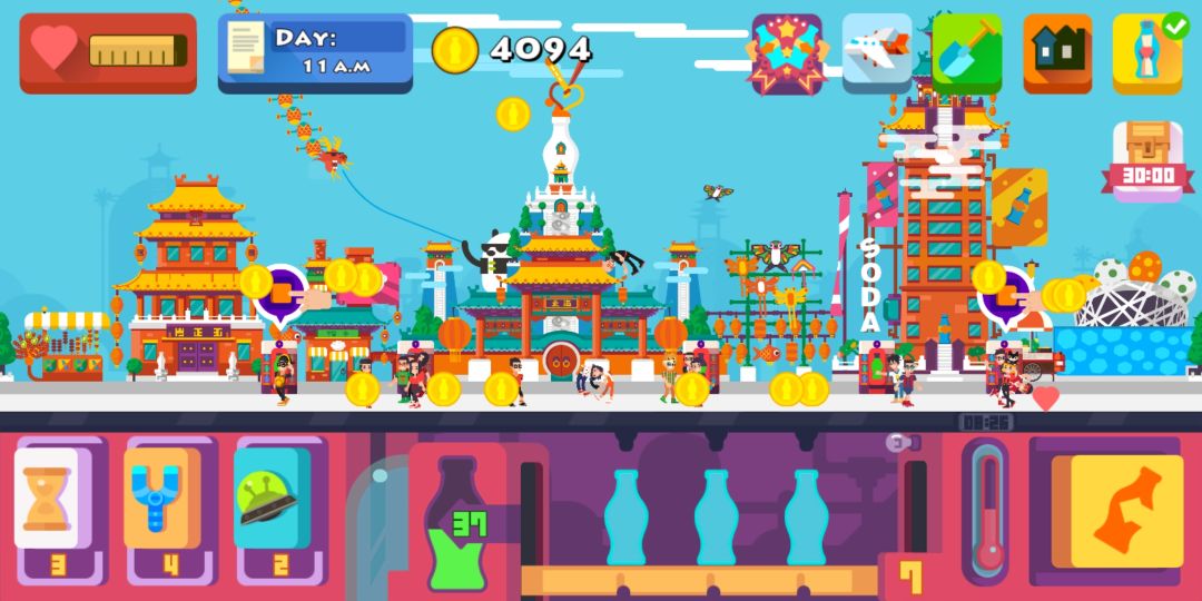而我们需要做的就是不停生产苏打,帮助市民完成心愿,生产不同口味的苏打(居然有芥末味!),达成他们的心愿,便可增加收益。心愿指数增加至满时,来个苏打派对,再适合不过了。悄咪咪的说,贩卖机空的时候比开派对更赚钱哦。想开世界连锁店?满足你,只要达到售卖量,带着苏打,就可以在整个夏天畅游世界。