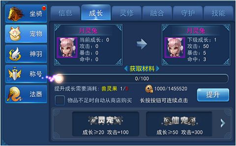 《永恒仙域》的世界中有多种宠物以供玩家选择,同时又有各类与宠物相关的系统以提升宠物战力。在消耗了相应系统所需的道具后,宠物就能变得更强!而成长,便是其中一个非常重要的系统。
