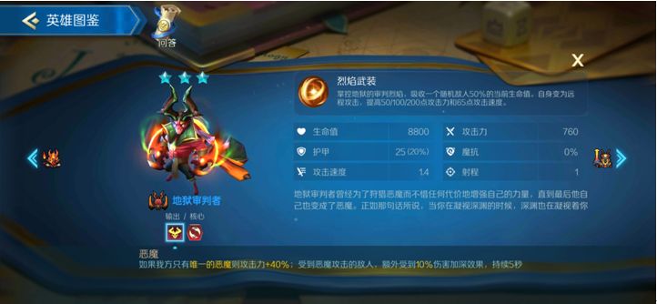 双手燃烧着烈焰,浑身散发着蒸汽般的光芒,就是地狱审判者的特征。他的技能为“烈焰武装”,可以吸收一个随机敌人50%的当前生命值。自身变为远程攻击,提高最多200点的攻击力和65点的攻击速度。