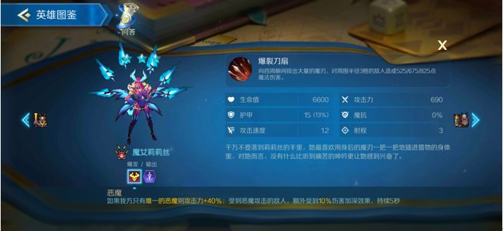 有着暗色皮肤的魔女莉莉丝,头顶有着6把燃烧中的火焰。她的技能为“爆裂刀扇”,可向四周瞬间投出大量的魔刃,对周围半径3格的敌人造成最大825点魔法伤害。简单干脆的伤害和战斗模式,深受众人的喜爱。